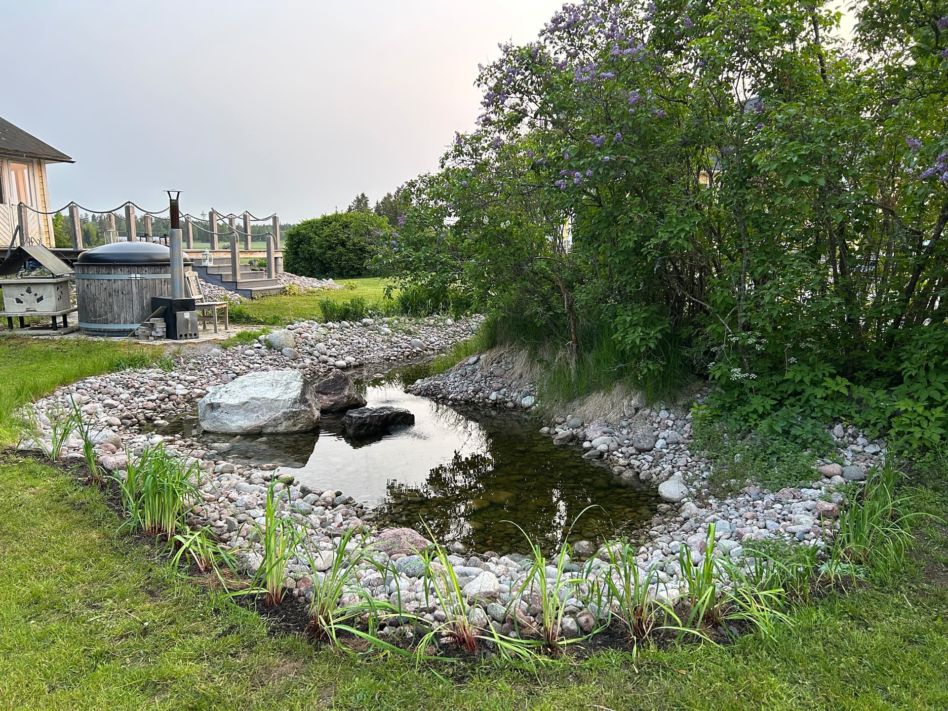 Työstin pihalammen reunaa. Irrotin sinnikkäät, kivien väliin kasvaneet juolavehnäkasvustot ja istutin siperiankurjenmiekkaa tilalle. Toiveena on, että jatkossa tuo reuna pysyisi siistinä.