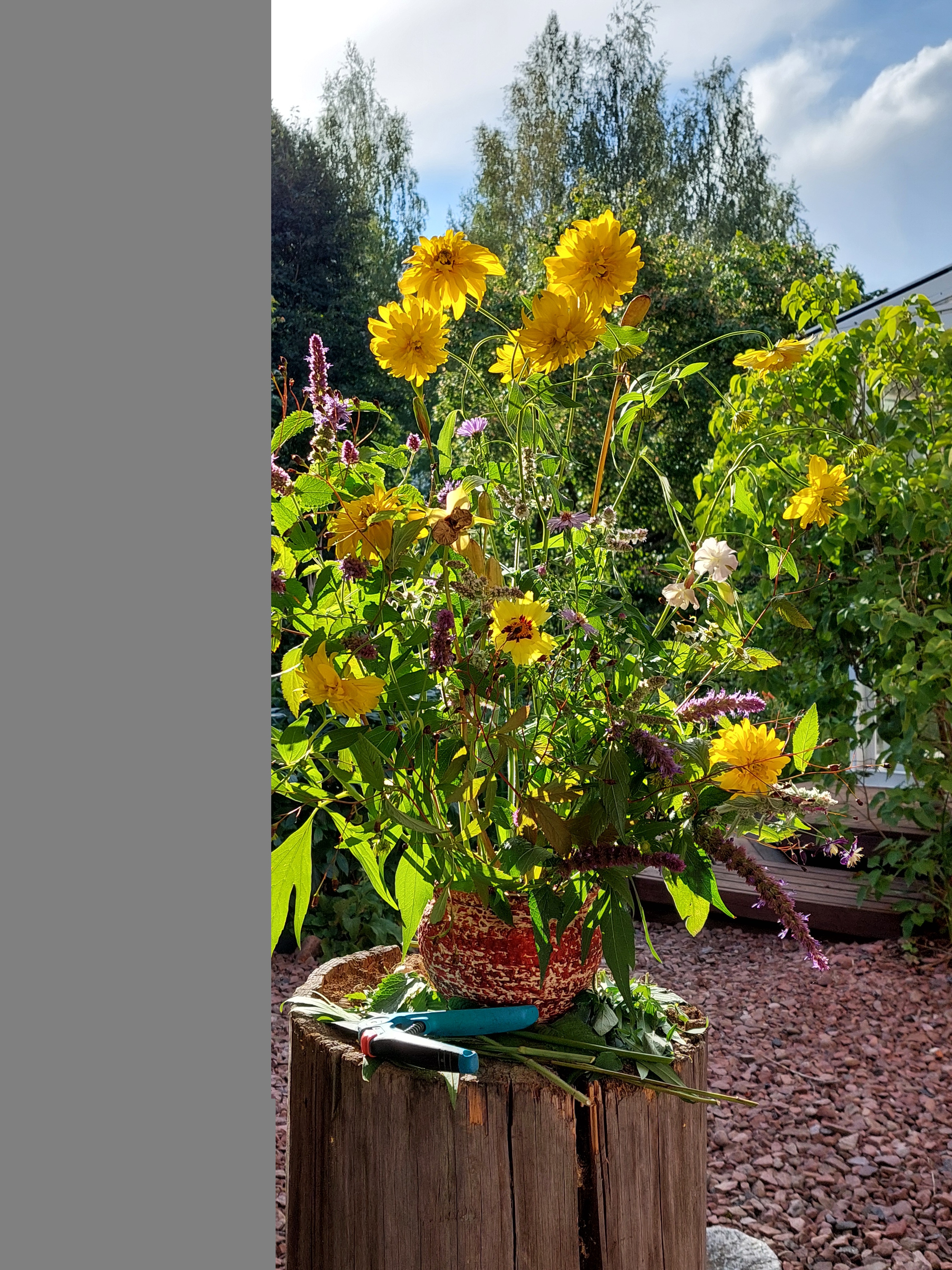 Aina sitä kaikkea istuttaa mutta huolto ei oikein kiinnosta. Nykyään kun on jatkuvia myrskyjä niin kaikki puut ja pensaat rötköttää mikä mihinkin suuntaan. Tänä kesänä kaikki on venynyt pituutta hurjasti mutta sittä eivät kuitenkaan seiso uljaana pystyssä. ![]()