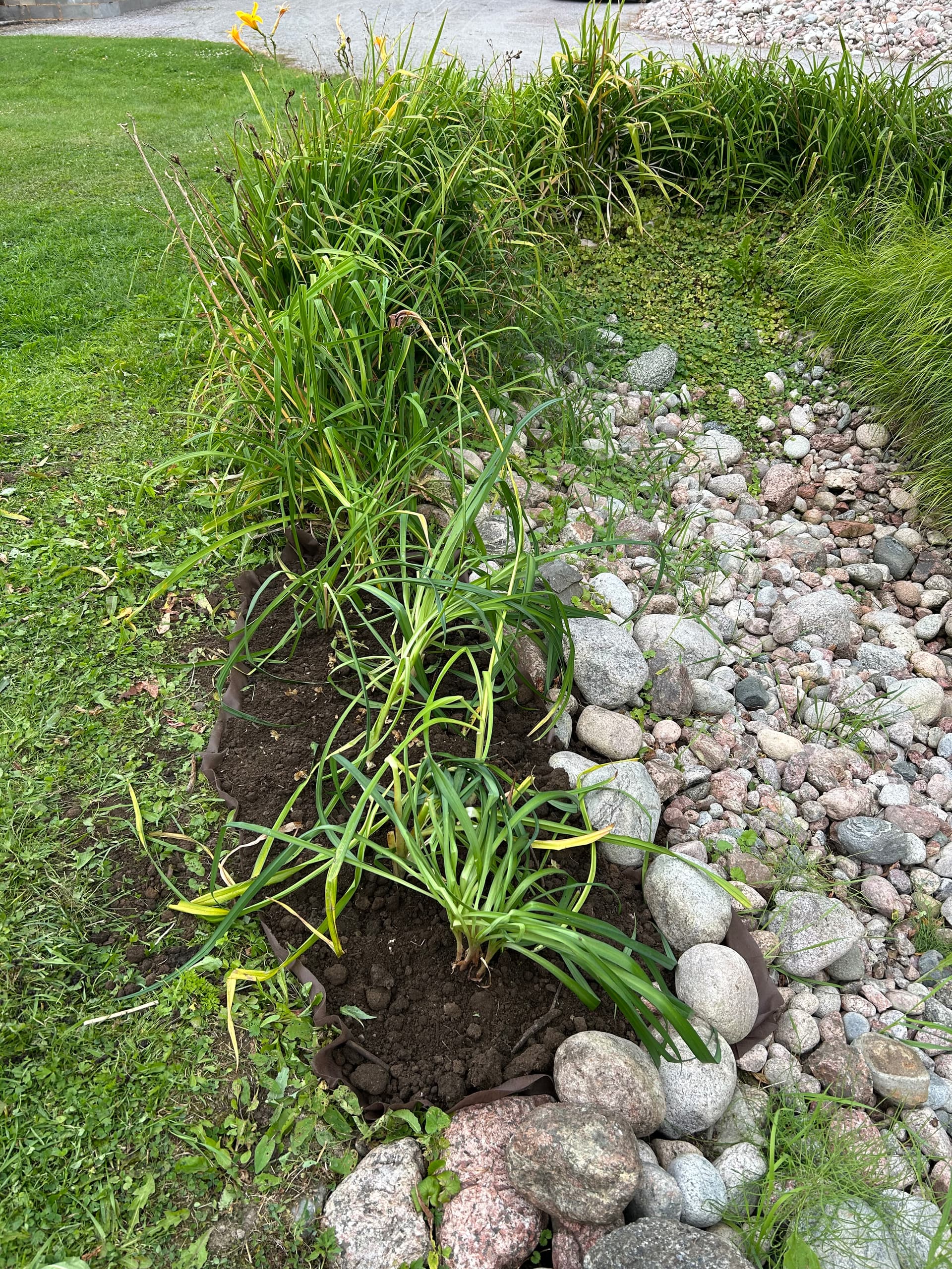 Lammen juurelle lisää päivänliljoja. Tuosta kohdasta lähti pahasti rikkaruohottunut rantakukkapuska, joka oli ränsistynyt jo vähän huonon näköiseksi.