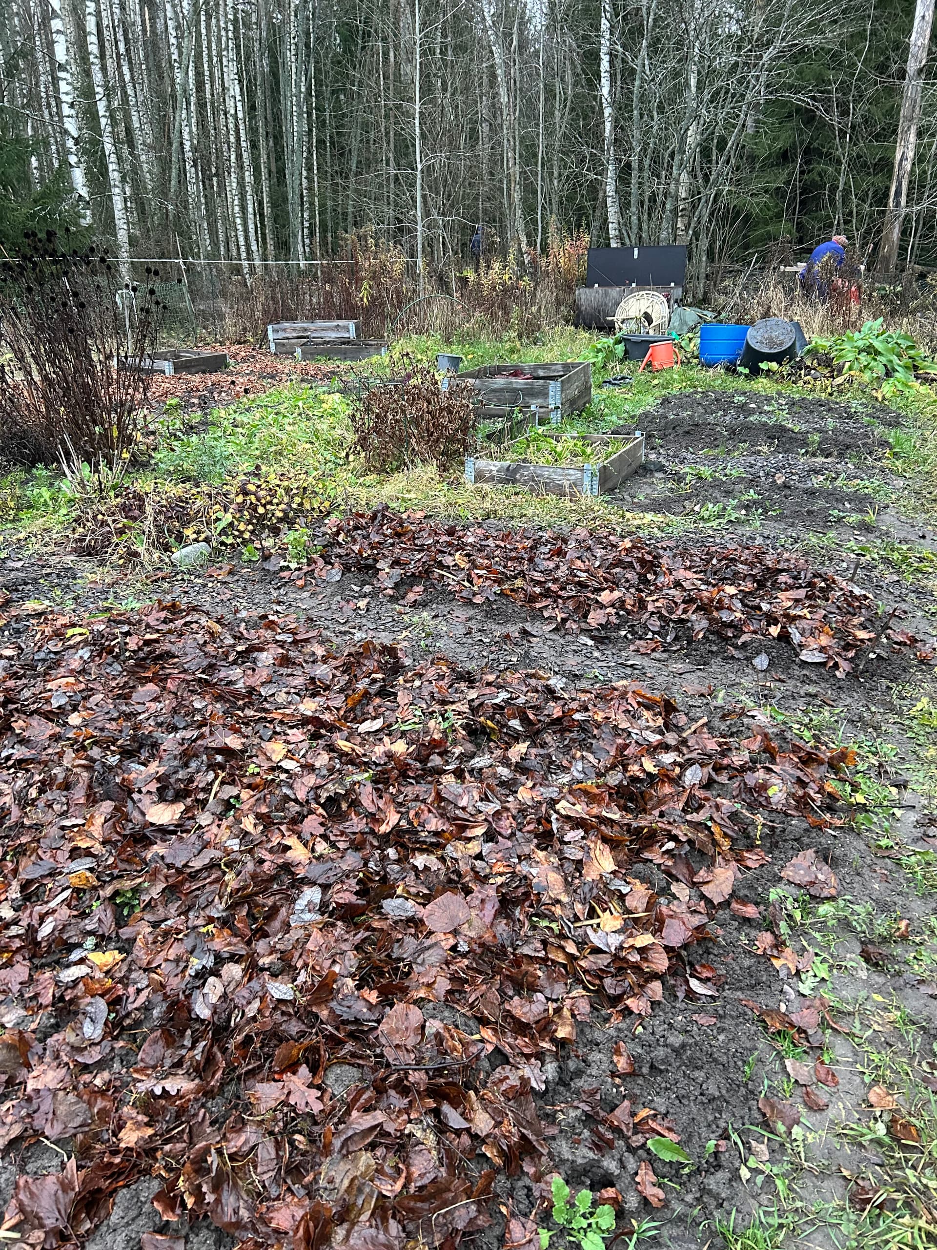Eilen haravoitiin äidin kanssa lapsuudenkotini pihaa ja vietiin lehtiä äidin puutarhapalstalle. Istutettiin valkosipulit. Kerrankin ei satanut. Hämärä tuli jo neljältä, päivä loppui äkkiä.