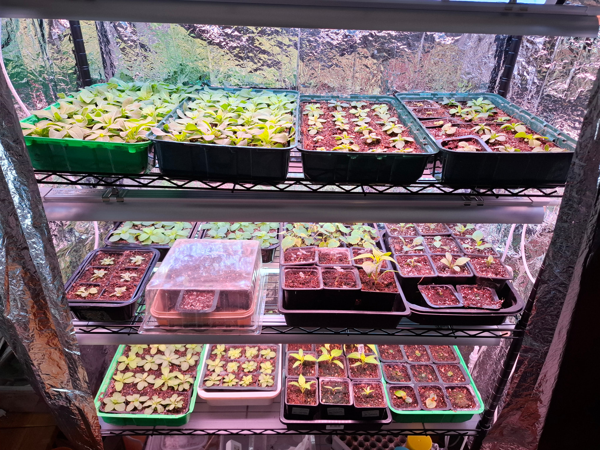 Tänään istutin turve ja kookoskuitunapeissa itäneitä ruukkuihin, kun juuret alkoi kasvamaan läpi. Revin aina niiden nappien kuoret roskiin ennen purkitusta, kun en halua niitä kuitukankaita käytetyn kukkamullan mukana maahan. Taimihyllyssä on nyt kolme valaistua hyllyä täynnä ja kaksi vielä vapaana. Onneksi eilen sain lahjoitettua petuniakylvöksen pois, niin ei tule enää pakottavaa tarvetta koulia niitä. Muutoin olen tänävuonna onnistunut jättämään kylvämiset vähemmälle, mutta onhan tässä vielä aikaa. Tomaatit laitan itämään kahden viikon kuluttua ja kai sitä jotain kukkiakin vielä ehtii.