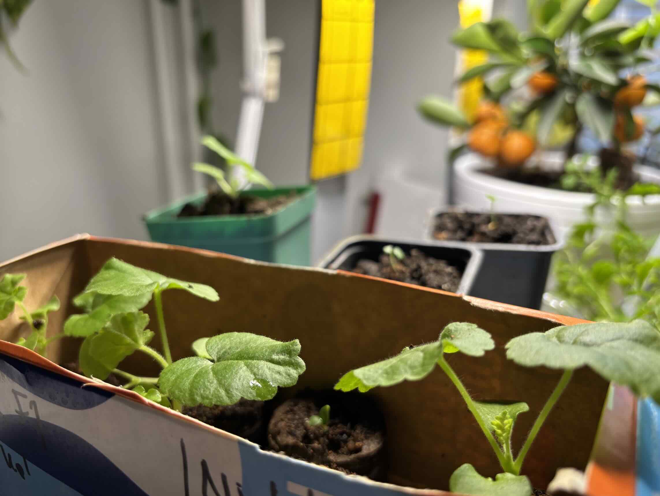 Tästä se taas lähtee. 17.12. kylvetyt pelargonintaimet ovat vielä turvepoteissa. Tarttis alkaa siirtää niitä ruukkuihin. Yhden jo siirsin, koska samaan pottiin testimielessä kylvetyt orvokinsiemenet itivät ja näkyvät tuossa taustalla. Tokmannilta ostettu ale-calamansi (kumkvatti) on pitänyt värinsä talven yli kasvilampun alla.
