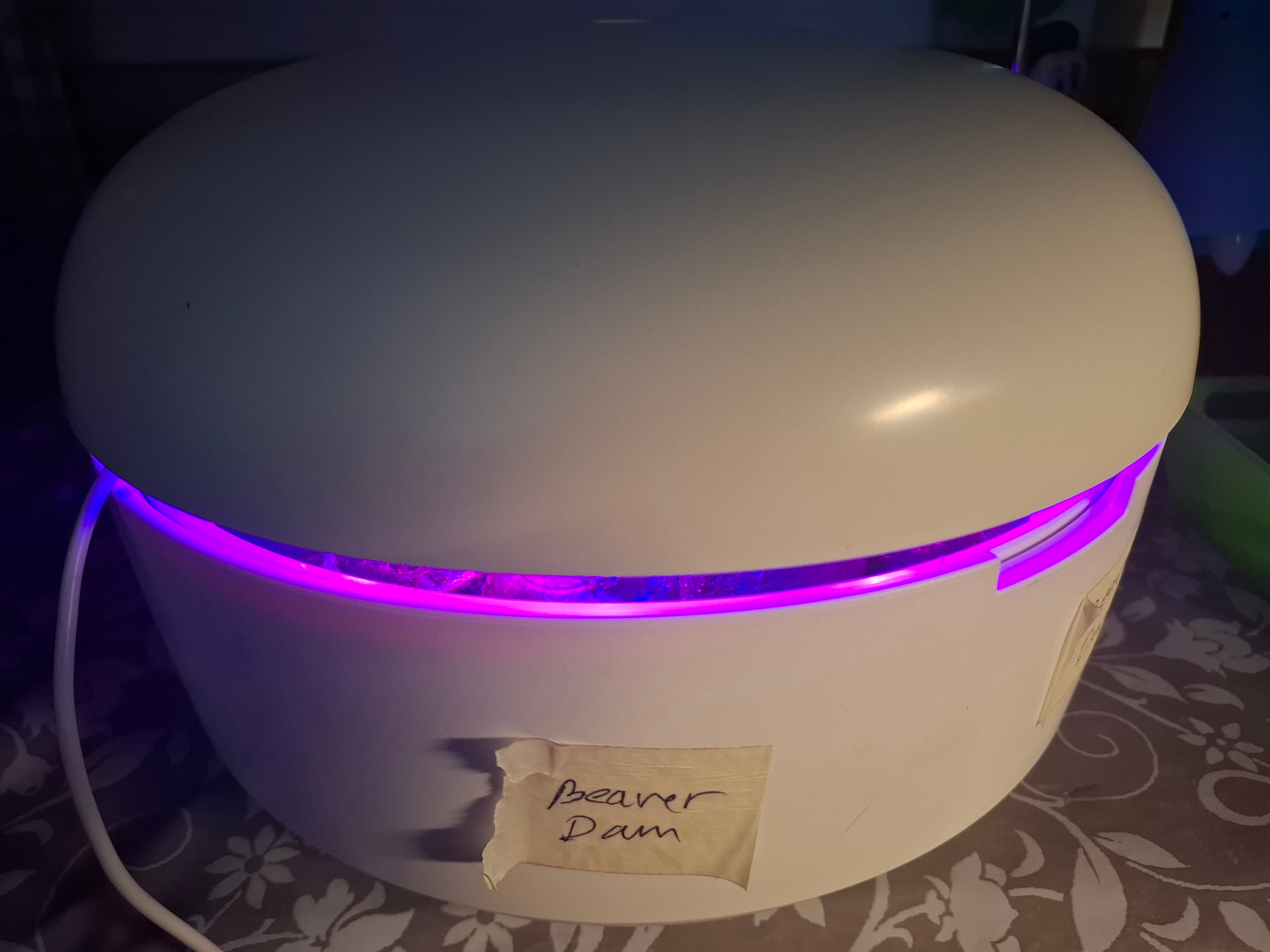 Itämässä on nyt keijunmekkoa, chilejä ja pari ruukkutomaattia. Systeemissä on valo päällä 16 tuntia vuorokaudessa. Idätysvaiheessa valo on pinkki, mutta jos hatun alle laittaa korotuspalan, valo on valkoinen. Tarkoitus on siirtää taimet muualle, kun ne lähtevät kasvuun.