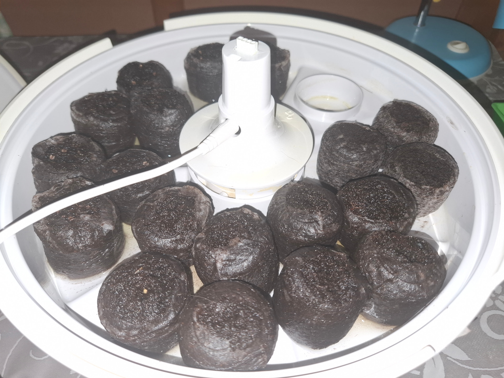 Pakko oli minunkin aloittaa kylvöt. Hain kaupasta turpeesta tehtyjä Jiffy pellettejä. Kokeilen idätystä Plantuissa, missä yleensä käytetään kivivillaa ja kasvatetaan yrttejä hydroponisesti. Poistin ylimmäisen levyn ja laitoin turvepelletit suoraan kastelualustalle.