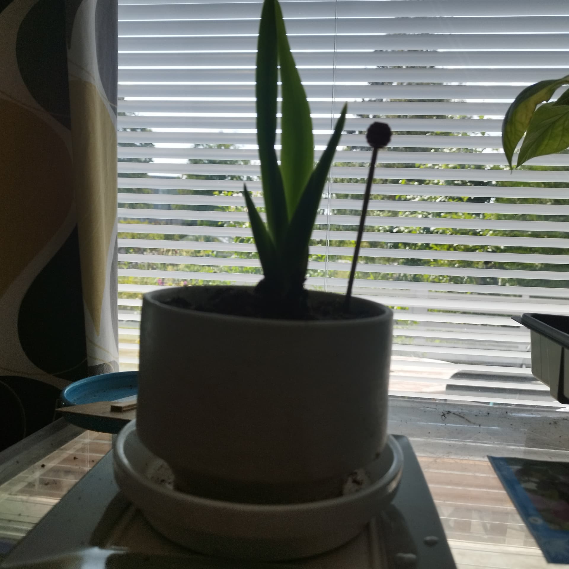 En enää malttanut odottaa. Kahden vanhimman lehden kustannuksella poistin emokasvin juuressa kasvaneet poikaset. 3.poikanen ( n.2 cm korkea) tulossa juureen. Nuput eivät ole lakaistuneet loppuun, joten en uskaltanut riipiä tuota kukkavarren päässä olevaa alkua irti.