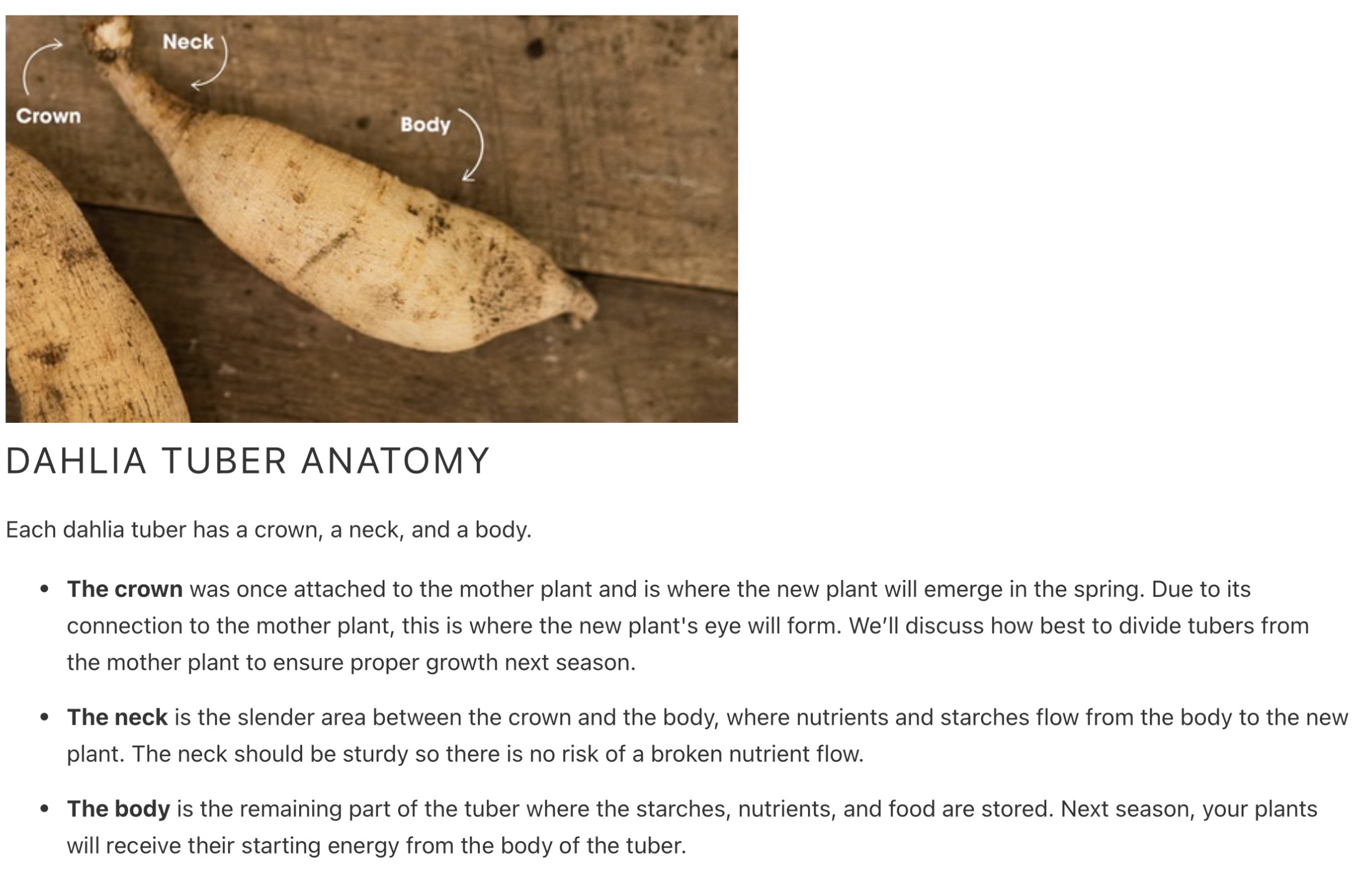 Jos istuttaa vain sen pötikän (body) multaan ilman niskaa (neck) ja kruunua (crown), silloin ei ole kasvupistettä eli silmää. Silmistä (ovat kruunussa) lähtee daalian varret kasvamaan.