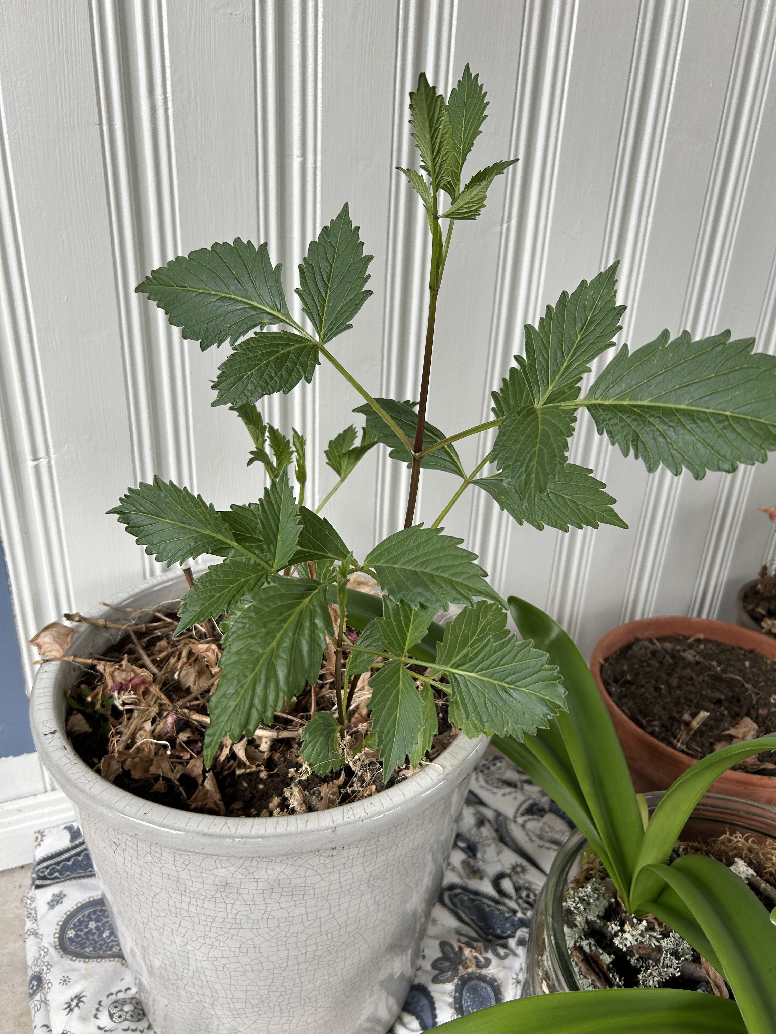Tässä daalia, jonka siirsin ruukkuineen tuohon syksyllä. Pitäisiköhän tätä jo alkaa kastella?