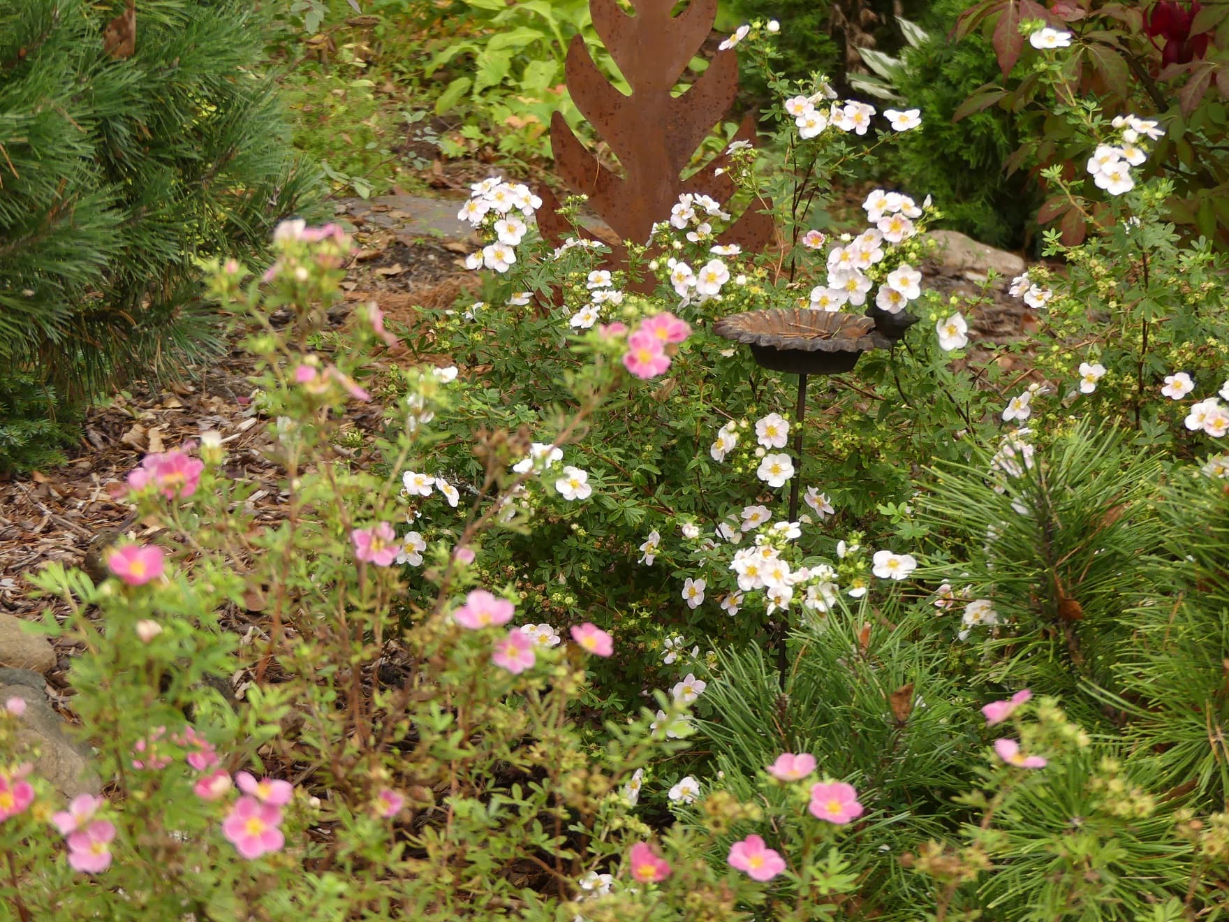 Annan sille keväällä kourallisen lannoitetta ja nyt elokuussa syyslannoitteen. Kuva on otettu 17.7.2016, jolloin pensas oli kukkinut jo muutaman viikon. Ja kukinta jatkuu pakkasiin saakka. Mikä toinen Suomessa kasvava pensas kukkisi yhtä kauan ilman hoitoleikkausta? Muita ei ihan heti tule mieleen.