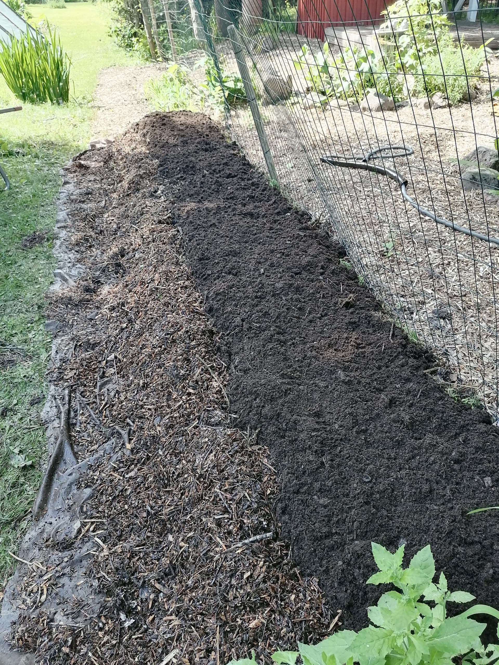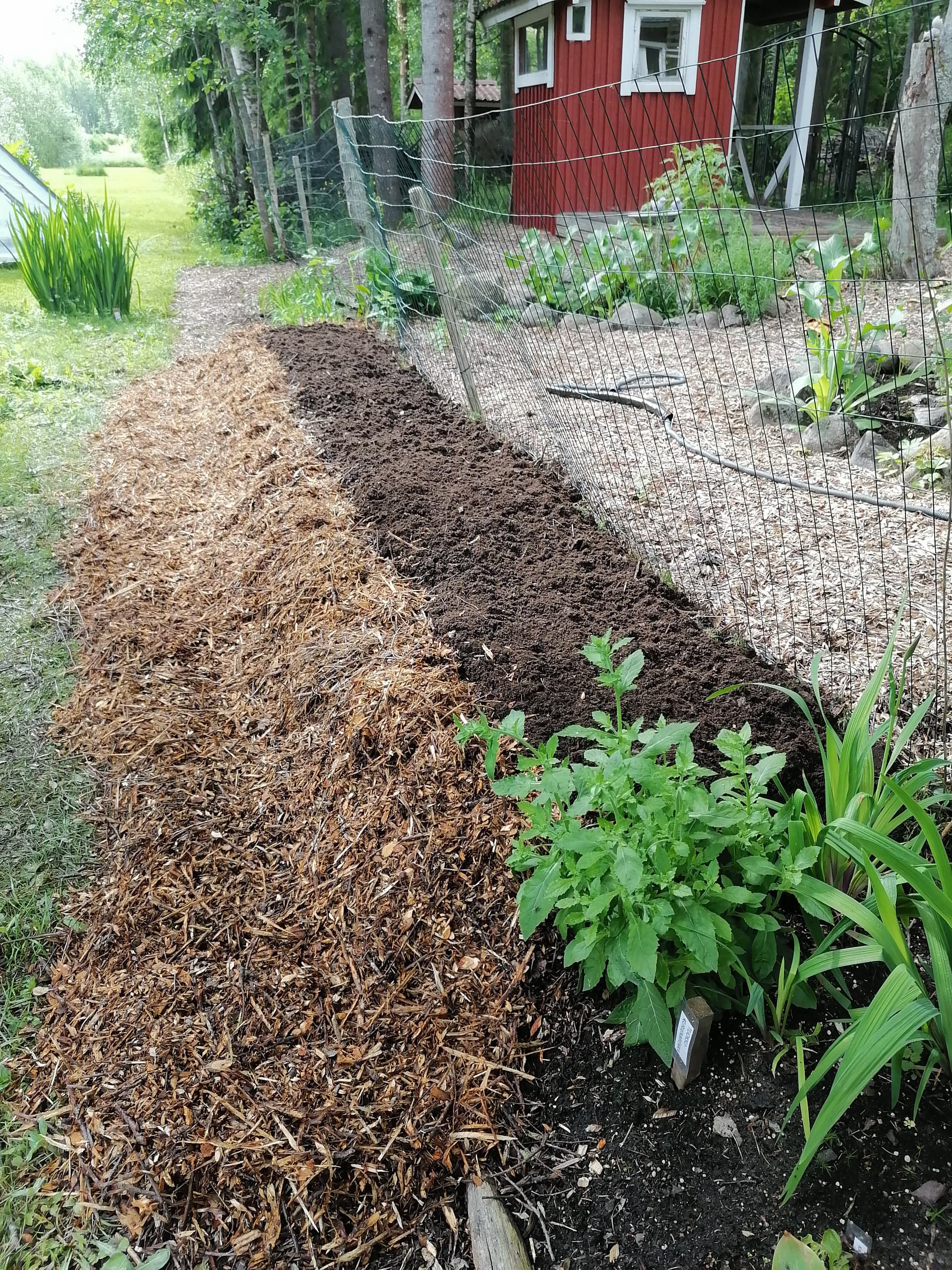 Päällimmäiseksi säkkimultaa. Penkin reunaan maanpinnasta yläreunaan vanhaa vuoden paikalla ollutta oksasilppurihaketta pitämään multa paikoillaan.