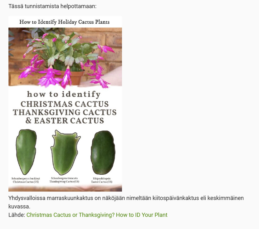 Muoks. 15.11.2025 / Nuu: LeonM jakoi 11.11.2025 Marraskuunkaktus-ketjussa kuvaviestin joka auttaa erottamaan toisistaan marraskuunkaktuksen, joulukaktuksen ja pääsiäiskaktuksen. Otin siitä kuvakaappauksen ja laitan sen tähän heti ketjun alkuun. 1 lehti joulukaktus, 2 lehti marraskuunkaktus ja 3 lehti pääsiäiskaktus.
