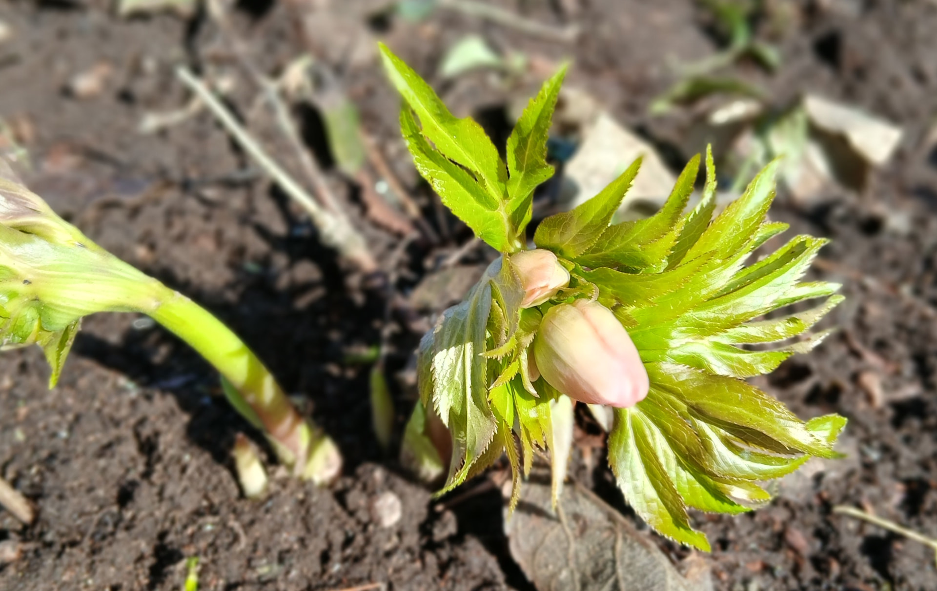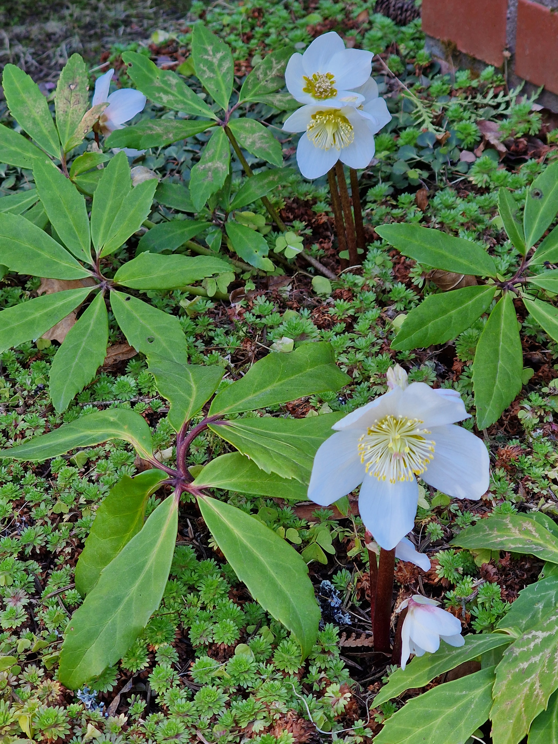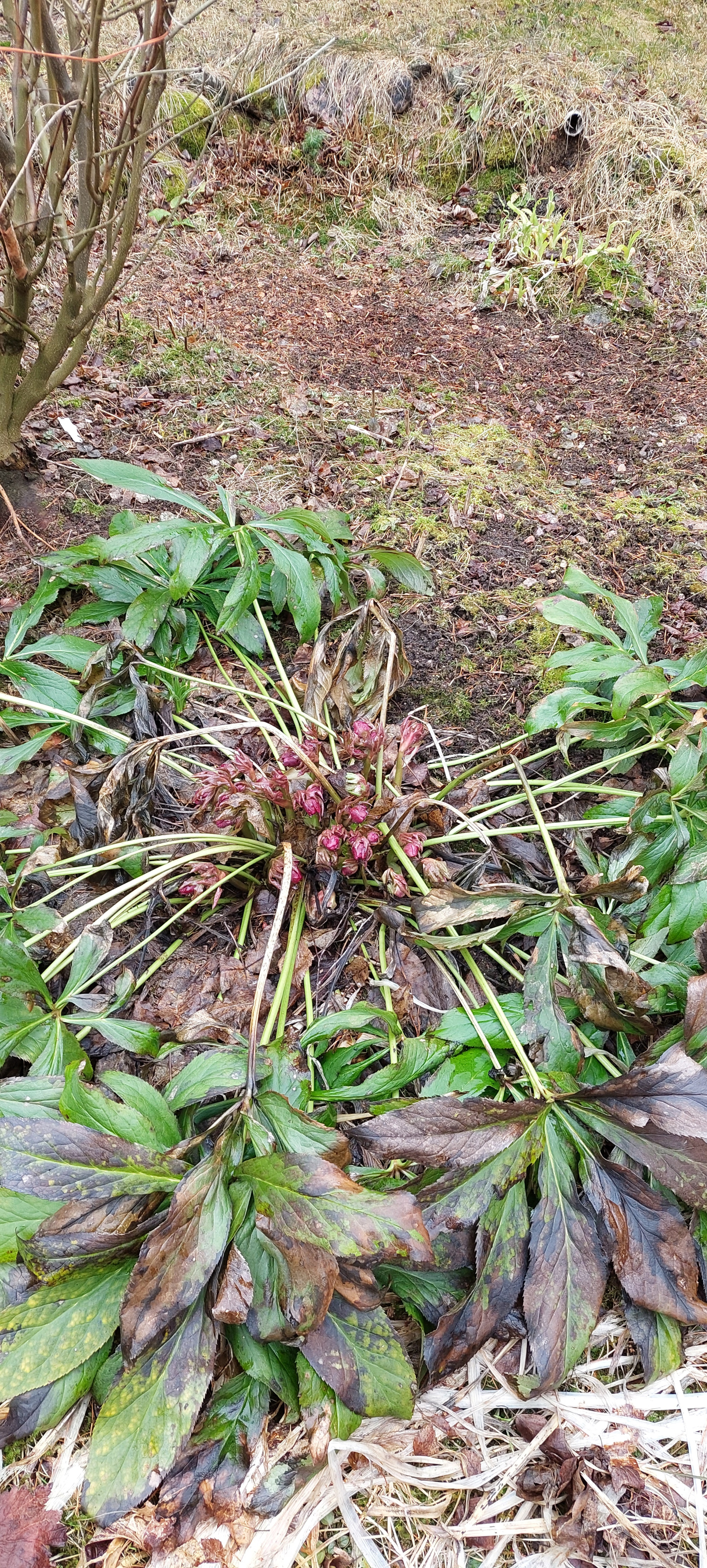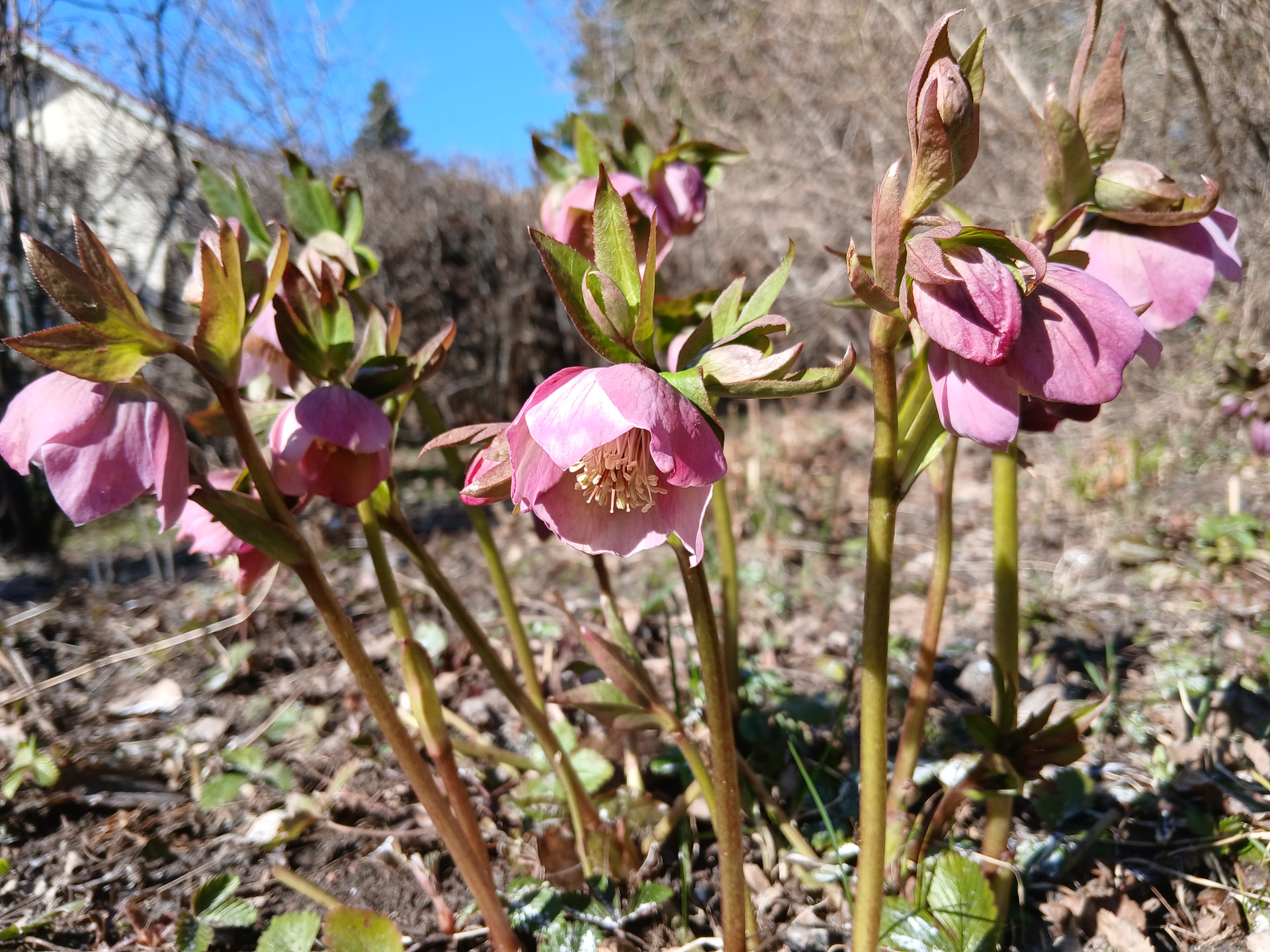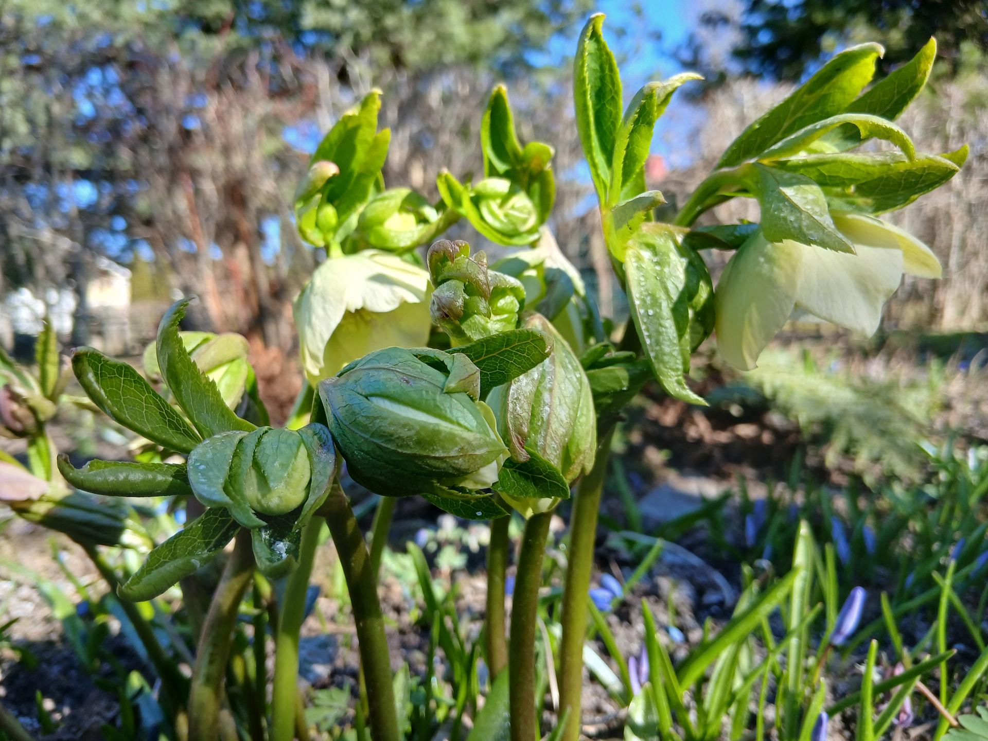 Ensimmäisiä kukkia jouluruusuissa. Osa nupuista ei selviytynyt talvesta tai kukat ovat vähän rähjäisiä