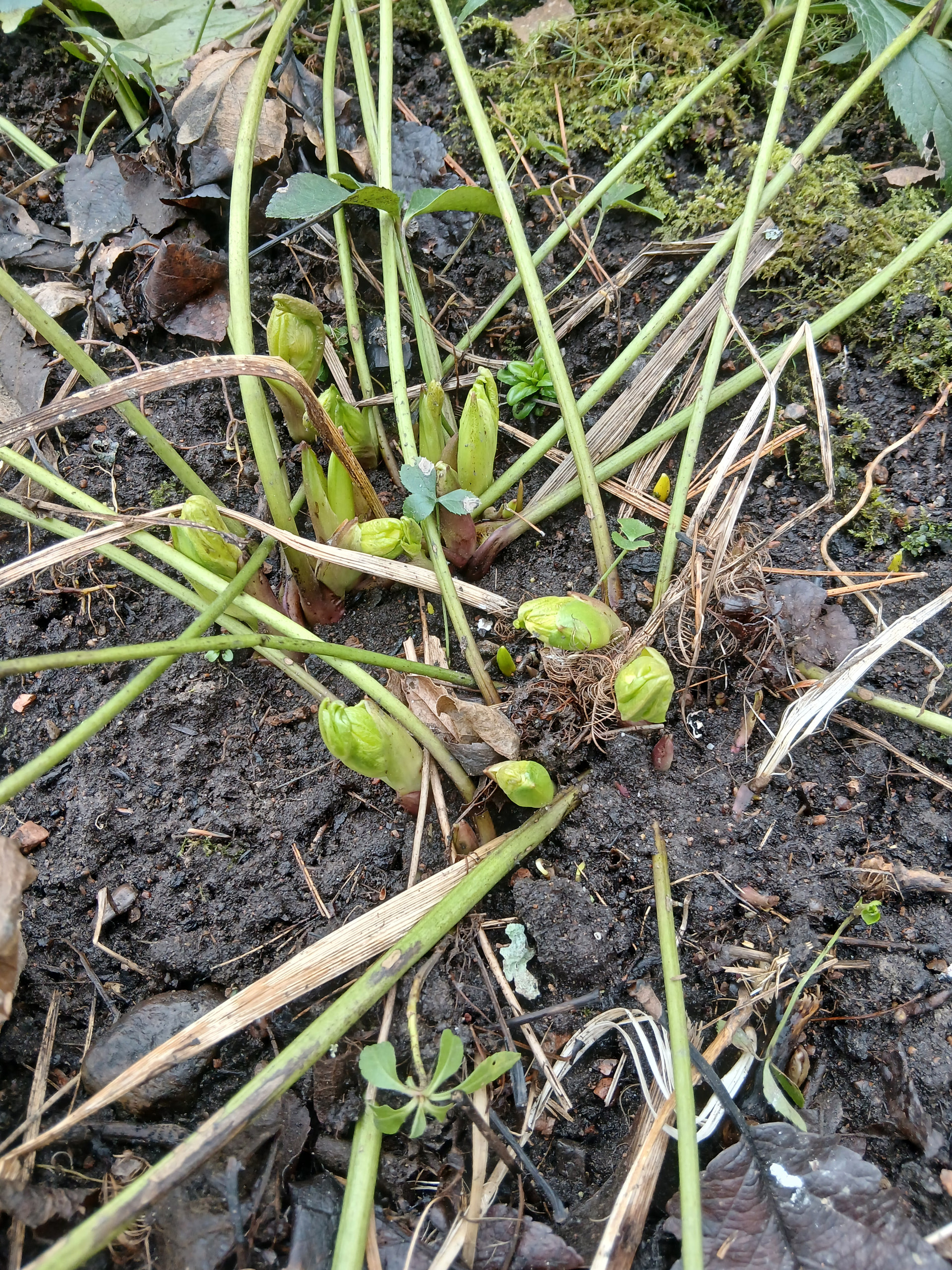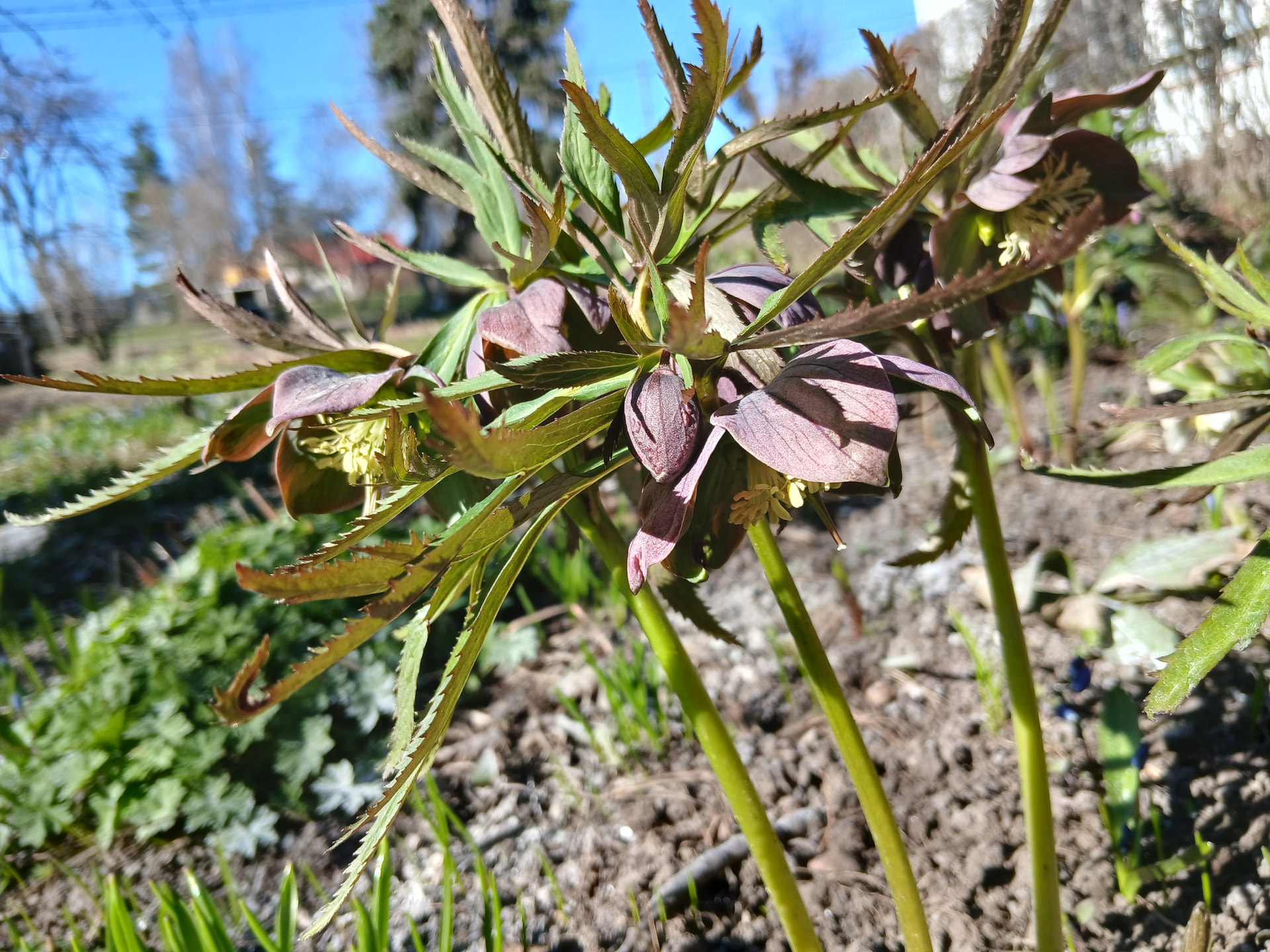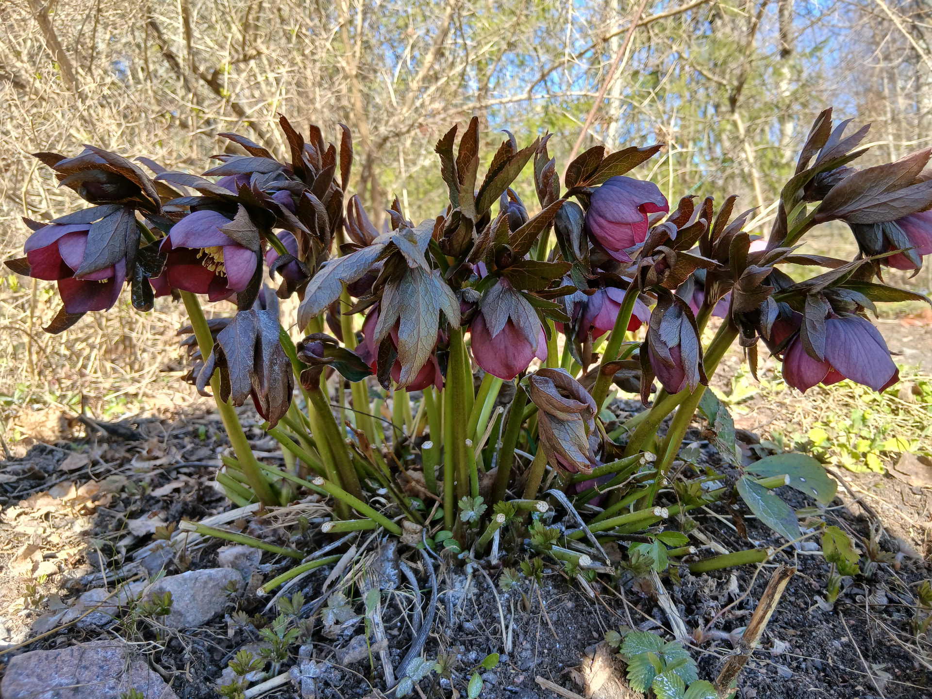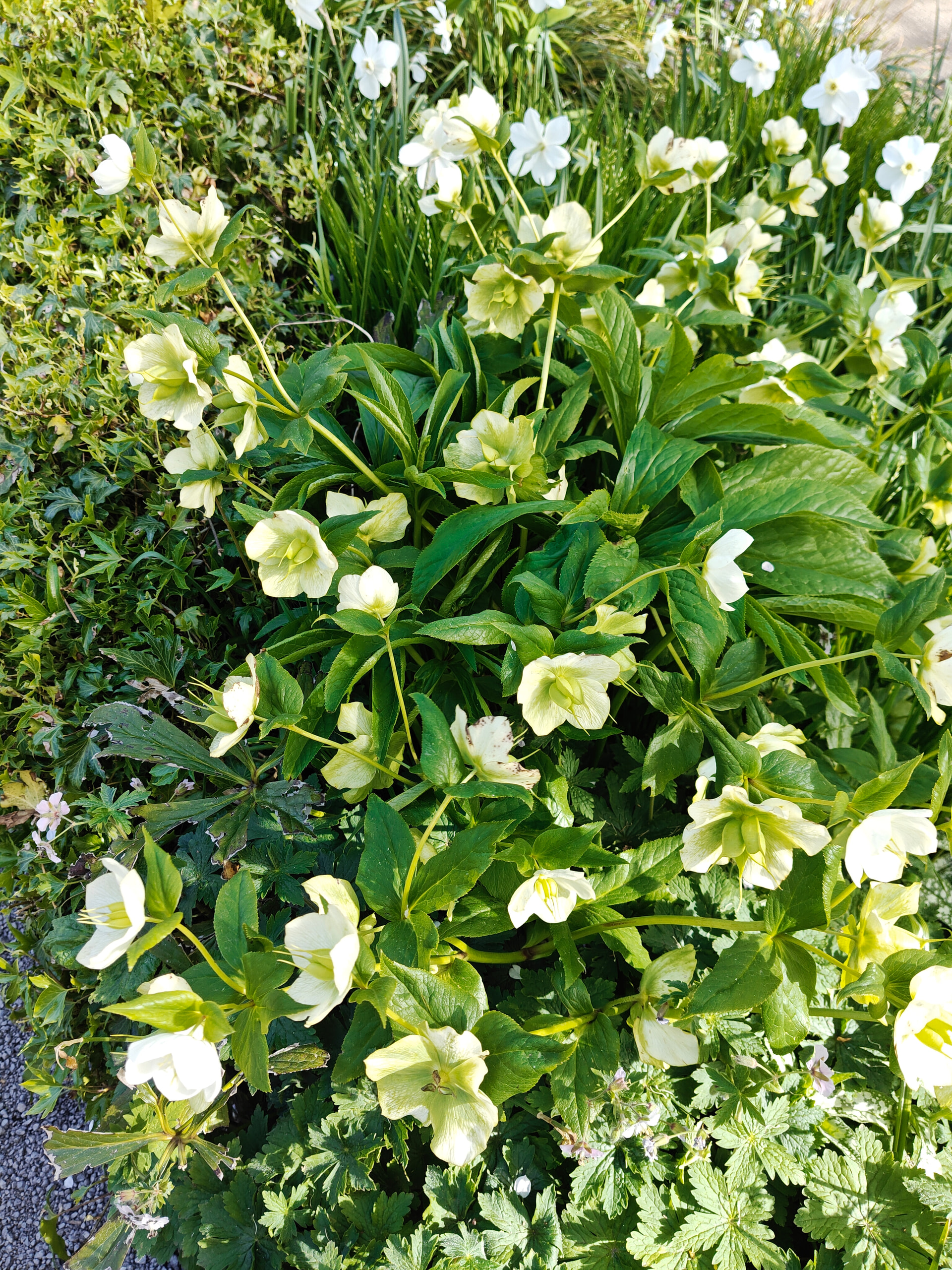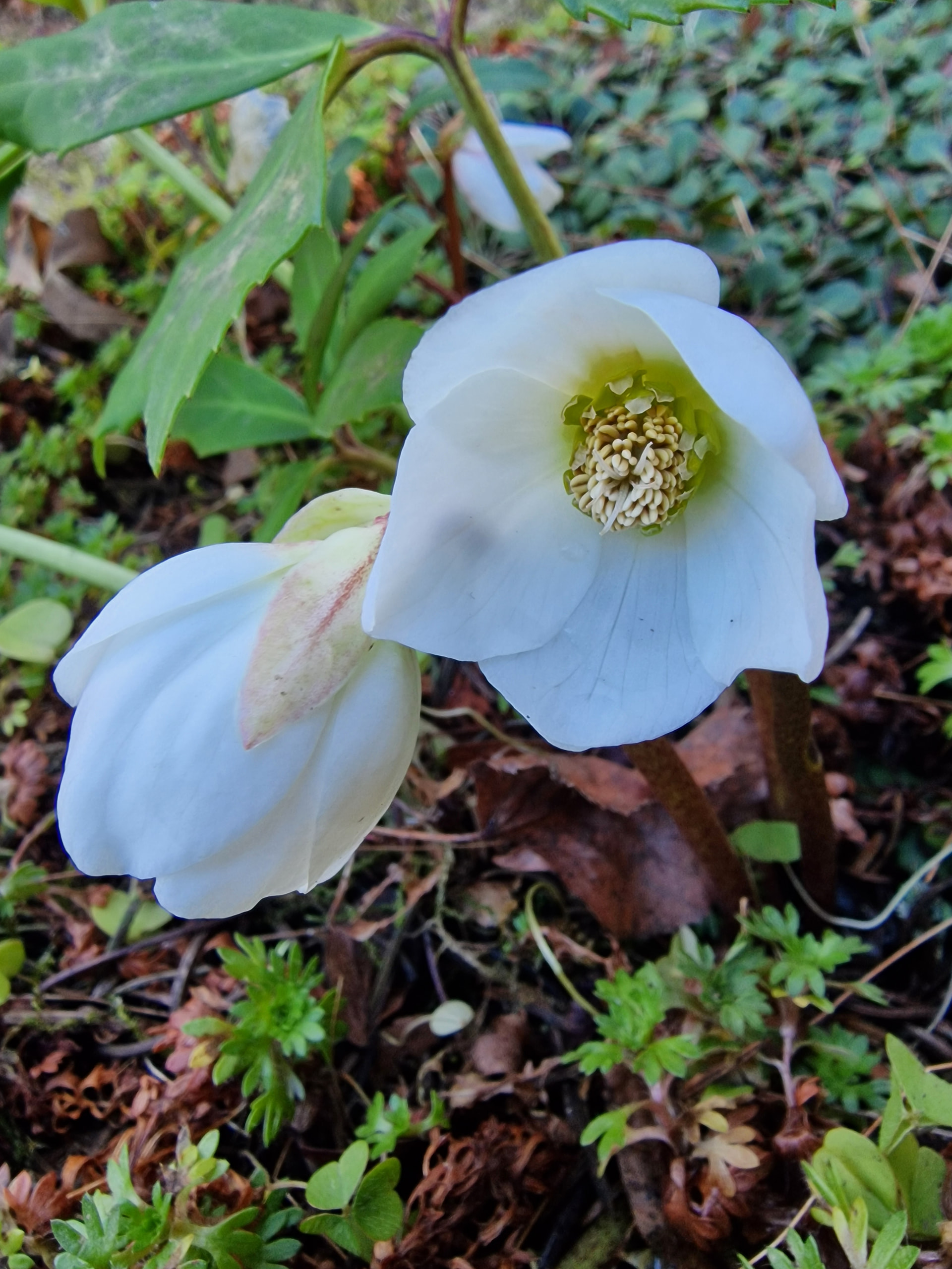 Ensimmäisiä kukkia jouluruusuissa. Osa nupuista ei selviytynyt talvesta tai kukat ovat vähän rähjäisiä
