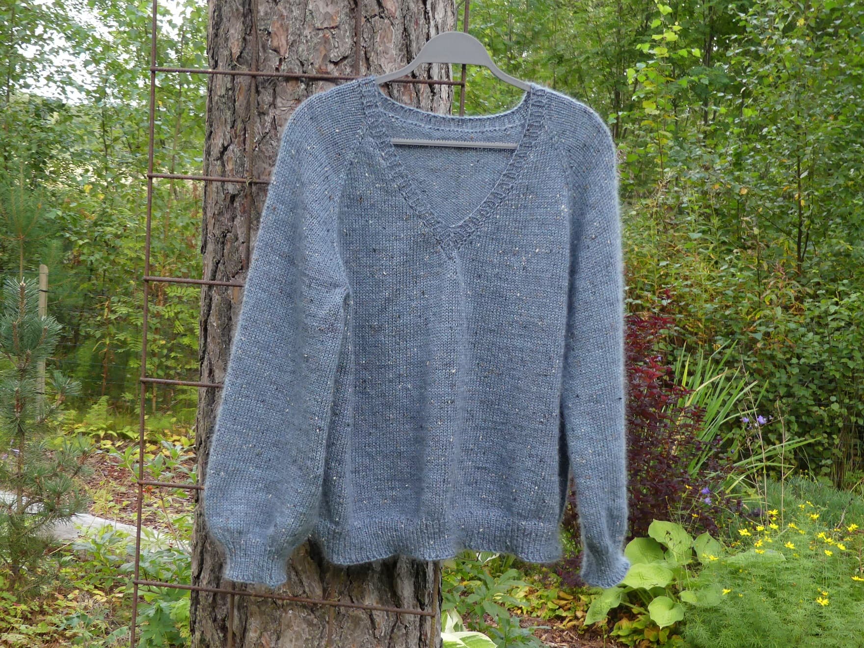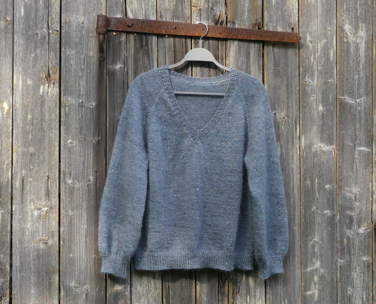 Tein paitaan ohjeesta poiketen pussimaiset hihat ja ei niin syvän v-kauluksen.