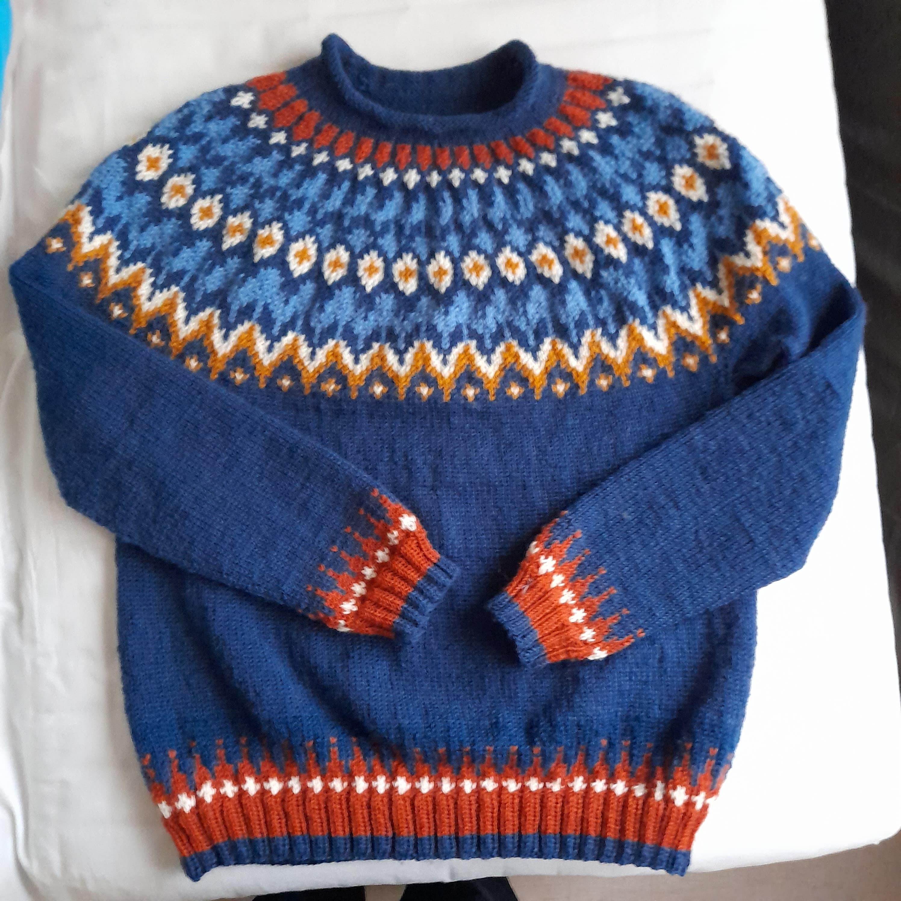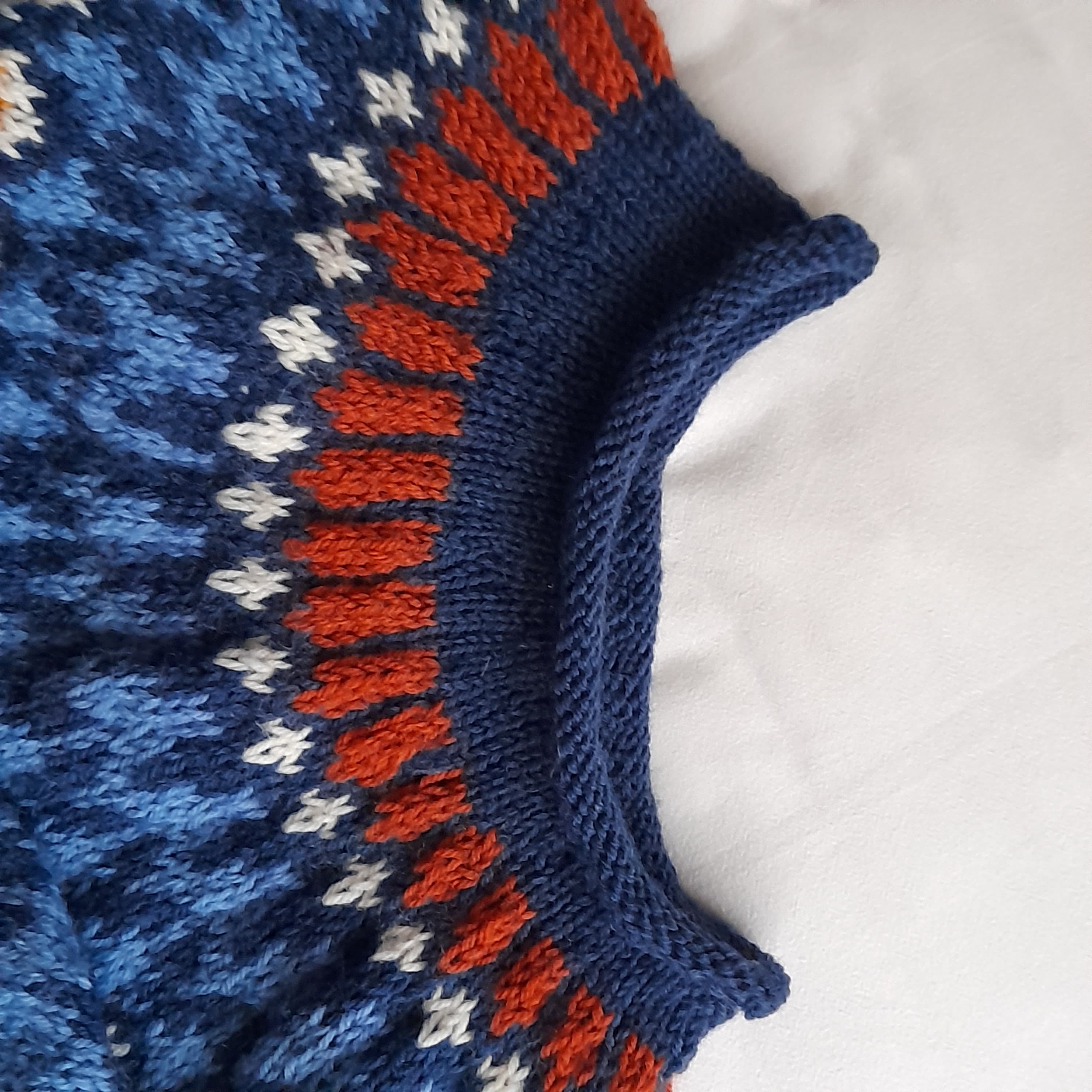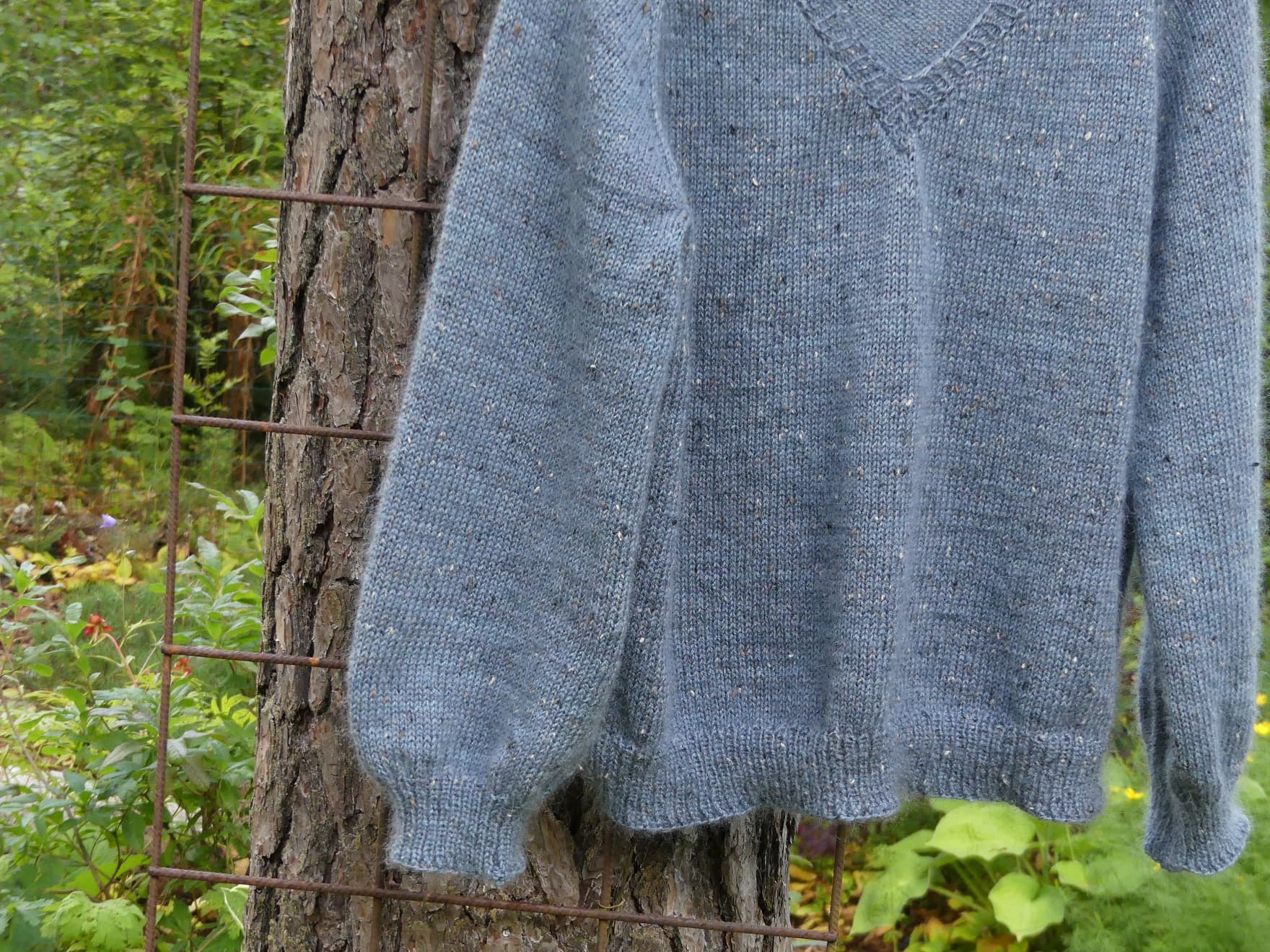 Valmista. Vielä kainaloiden silmukointi ja lankojen päättely sekä kastelu.