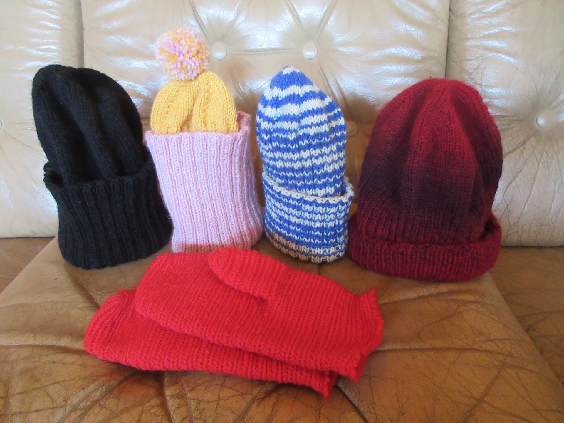Useamman kuukauden aikana tehdyt, neljä pipoa ja yhdet kintaat.