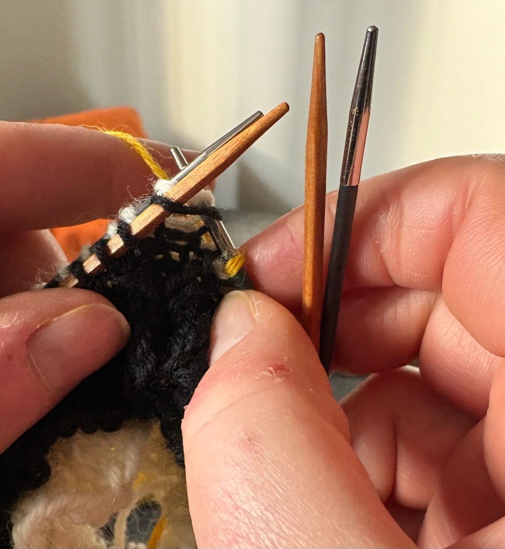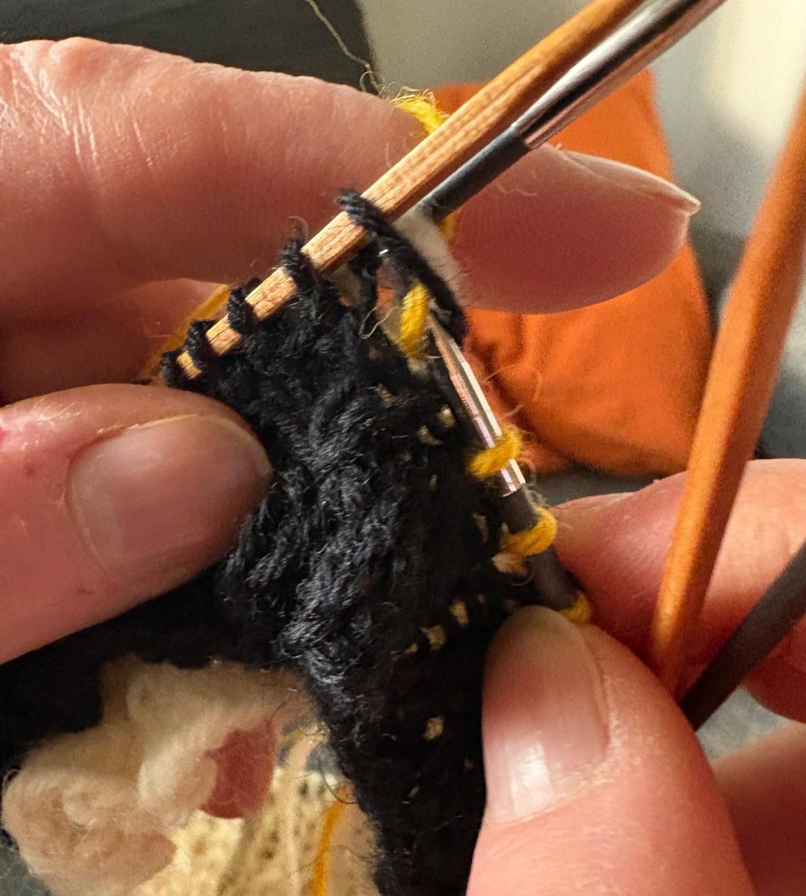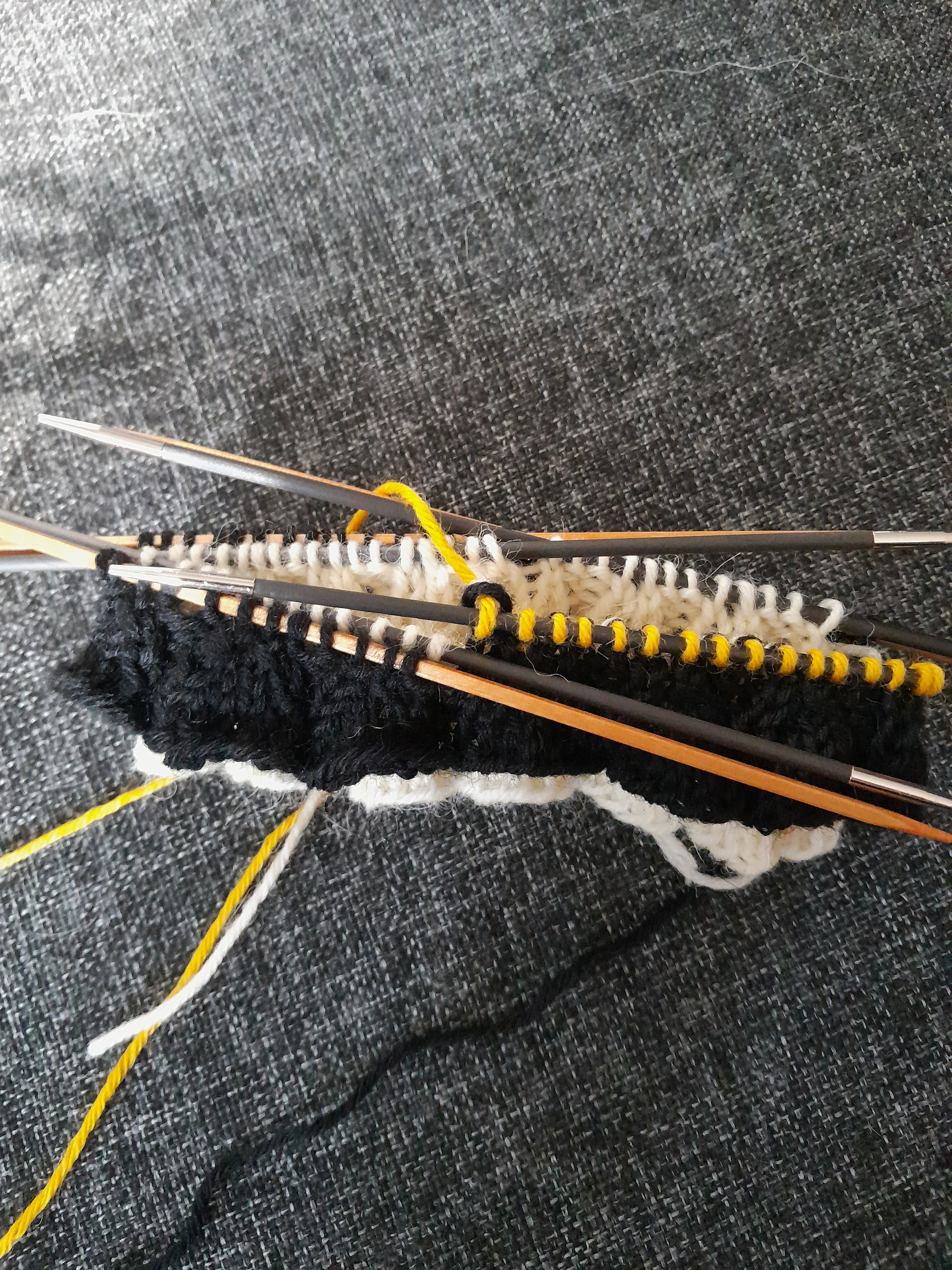 Sitten neulon ne päällekkäin yhteen keltaisella langalla, eli teen kaksille puikoille ne röyhelöt ja neulon kerralla kummankin silmukoiden kautta ne sitten samalle puikolle päävärillä.
