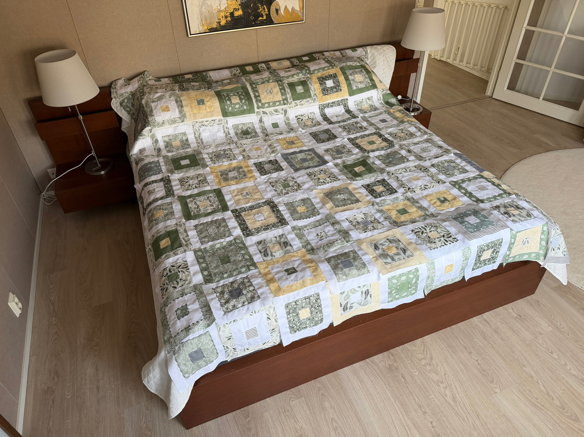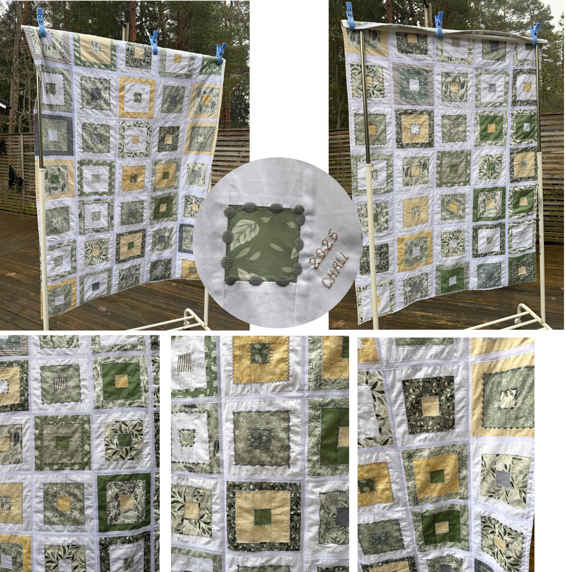 Valmiina on 112cm x 155cm, on kaksipuoleinen eli on tilkkuilu edessä ja takana. Välissä on ohut vanukerros. Kanttausnauhaa meni 40-50 metriä, kangasmenekistä ei mitään tietoa.