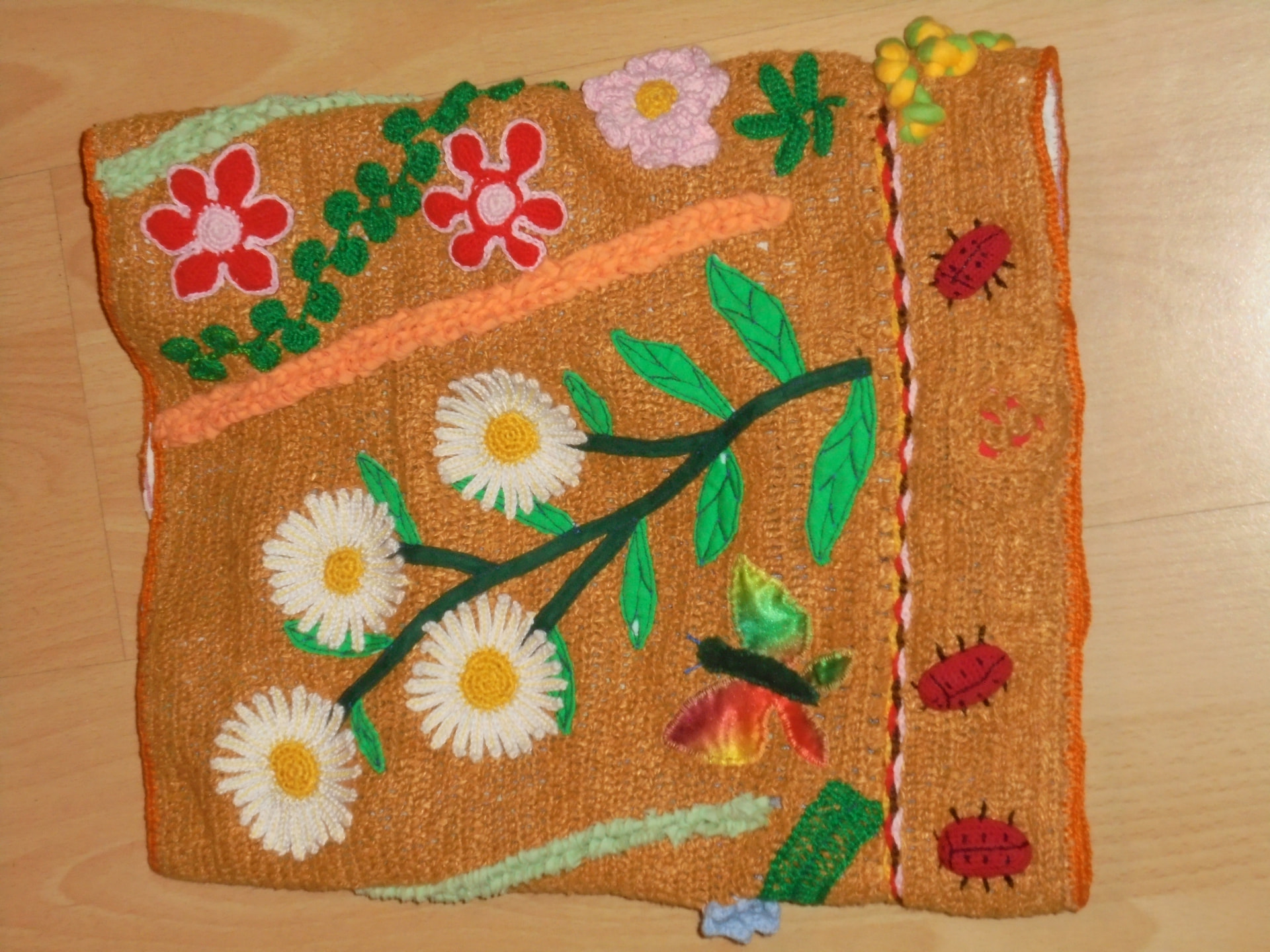 Näpertelin muistisairaalle tädille hypistelymuhvin. Päällinen on virkattu, vähän yksityiskohtia ommeltu. Vuoriin käytin erilaisilta tuntuvia kankaita, joissa oli laskoksia ja poimutusta.