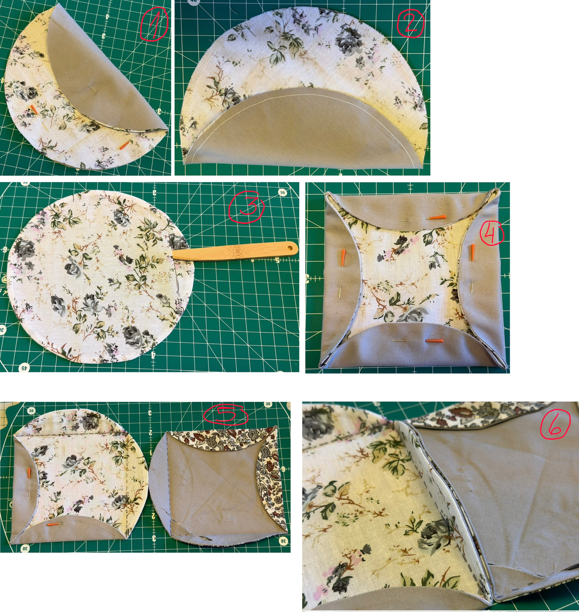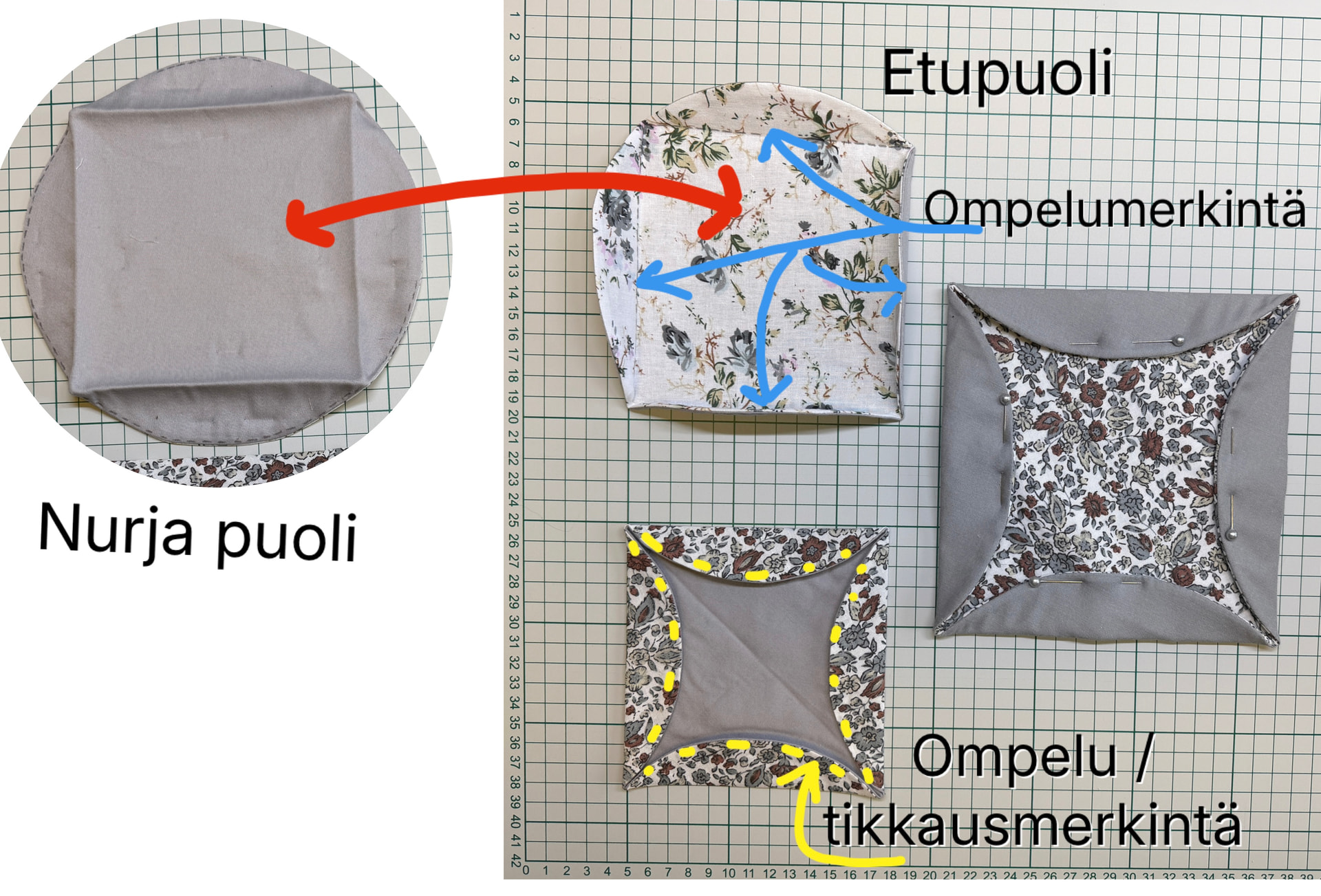 - kaksi samankokoista kangasympyrää, oikeat puolet vastakkain ja 2. ommellaan nurjalta puolelta kokonaan kiinni. 3.leikataan varovasti toiseen kankaaseen viilto ja käännetään työ oikein (oikeat puolet ulospäin). Tässä vaiheessa jos haluaa vanua väliin, leikkaa pyöreä vanupala ja pujota se kankaitten väliin ja silottele suoraksi. 4.silitä sauma täysin auki oikealta puolelta. Apuna käy joku tikku jolla sisältäpäin varovasti työntämällä saadaan sauma siistiksi ja silitys on helpompaa, silitä myös ”siivekkeet sisäänpäin. 5.merkkaa kynällä silitysjälki, jäljen mukaan 6.ommellaan kiinni seuraavaan palaan.