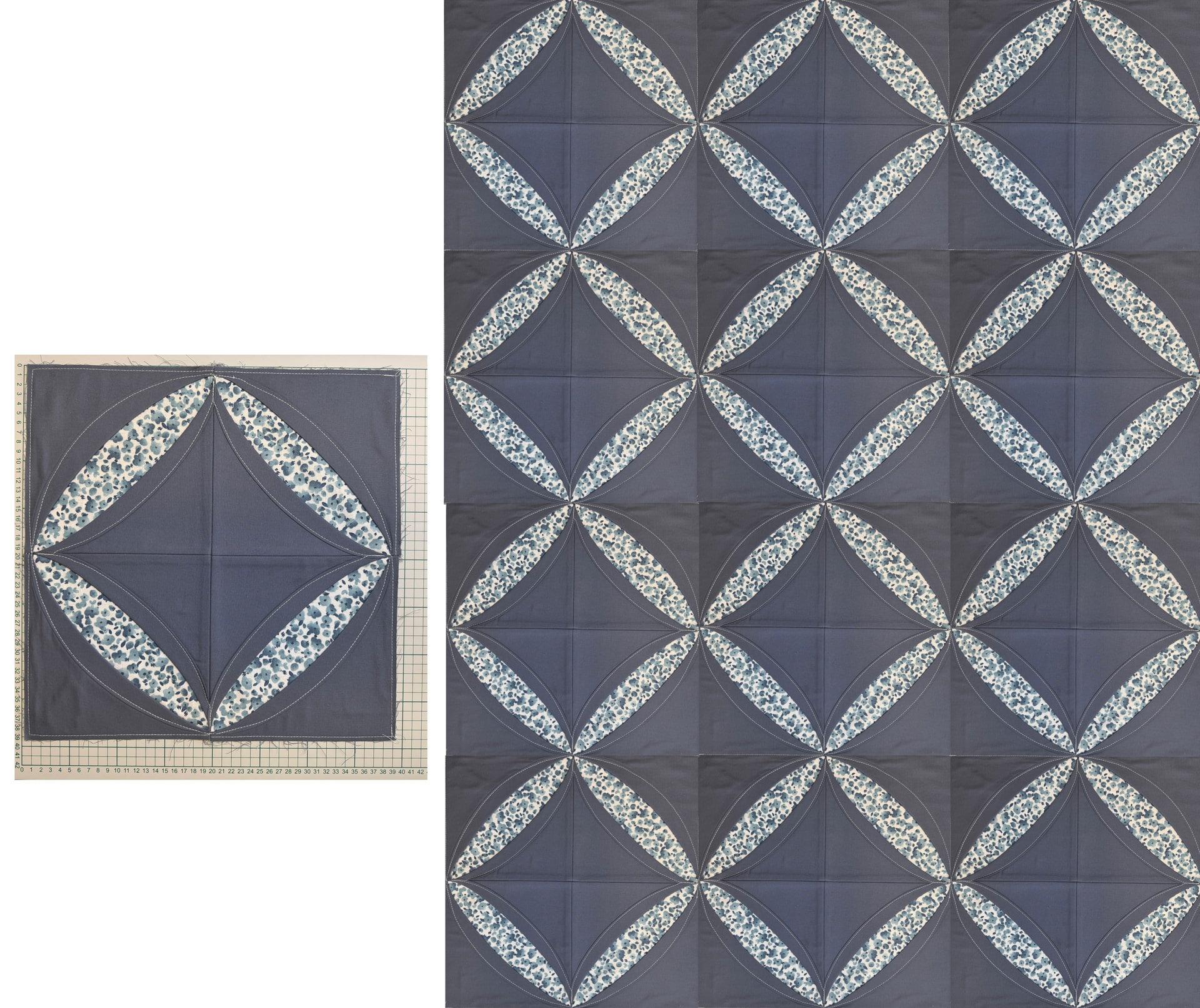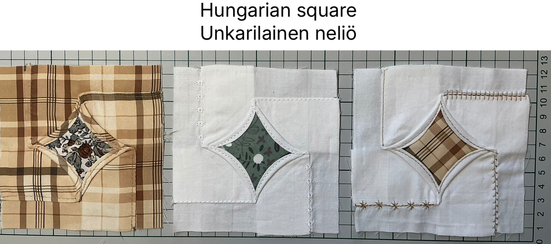 Tykkään tästä mallista kovasti. Ei ole vaikea tehdä, työvaiheita on aika monta ja joutuu olemaan tarkkana kohdistuksessa. Koon voi itse määrittää vapaasti. Tämän yhden ruudun koko on 39cm x 39cm. Silitysrauta on paras ystävä, ompelu on helpompaa.