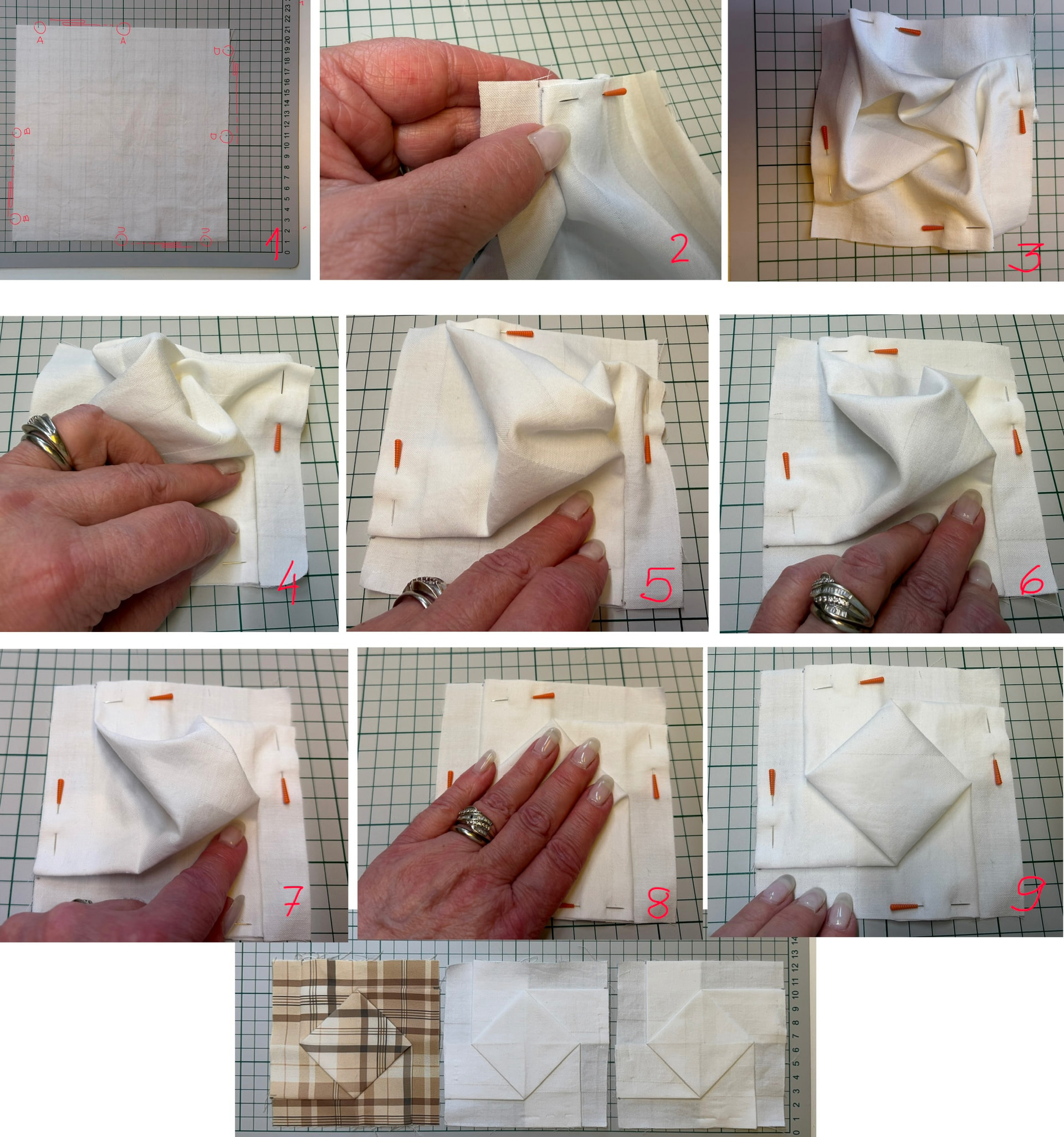 8 - 9 - siloittele sormin keskiöön tullutta neliötä ja siisti tarvittaessa taitteet.