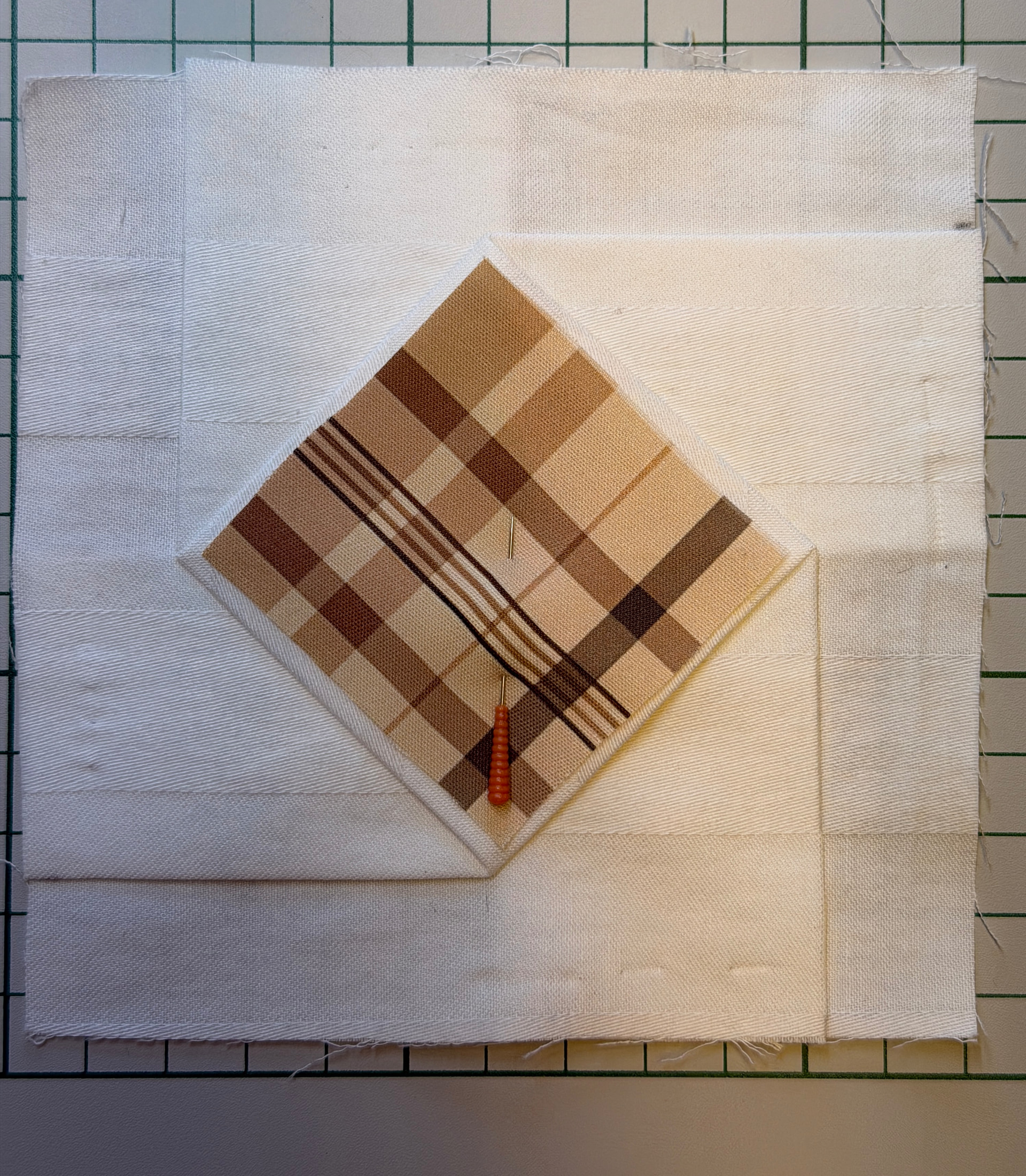 Jos haluaa keskelle katedralin ikkunan, leikkaa kangaspala vähän pienemmäksi kuin keskineliö. Taita sivut kangaspalan päälle ja kiinnitä neuloilla taitos.