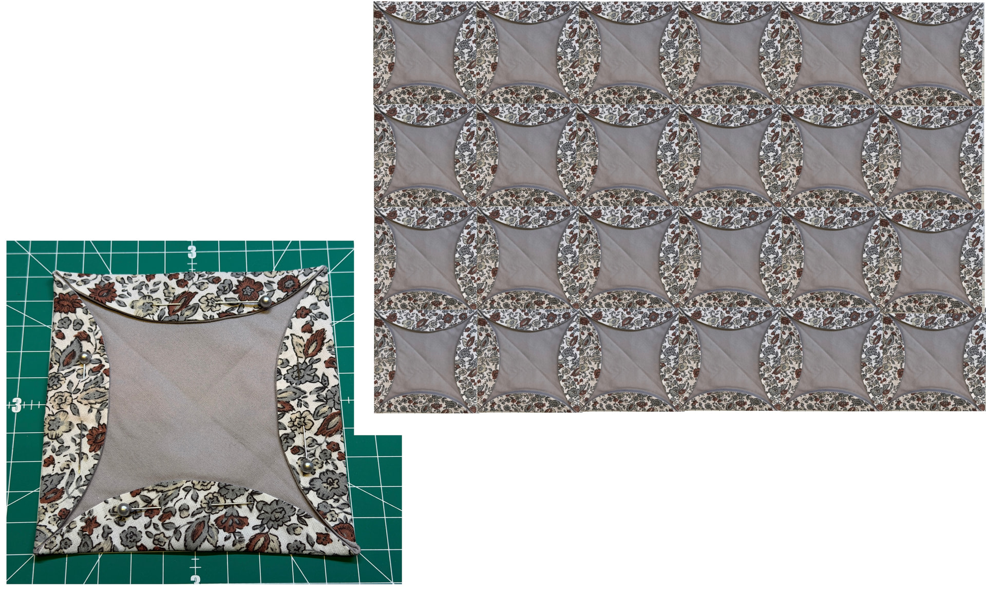 Tämä malli on neliskanttinen, osa kangaspaloista on tuplana ja toiset yksinkertaisina. Vasemmanpuolinen kuva on valmis ruutu joka sitten kiinnitetään muihin ruutuihin. Oikeanpuolinen kuva, kuvamanipulaatio!!!, on sitten tilanne kun on useita ruutuja ommeltu yhteen. Olen siis tehnyt yhden ruudun valmiiksi, kopioinut sen ja yhdistänyt kuvat.