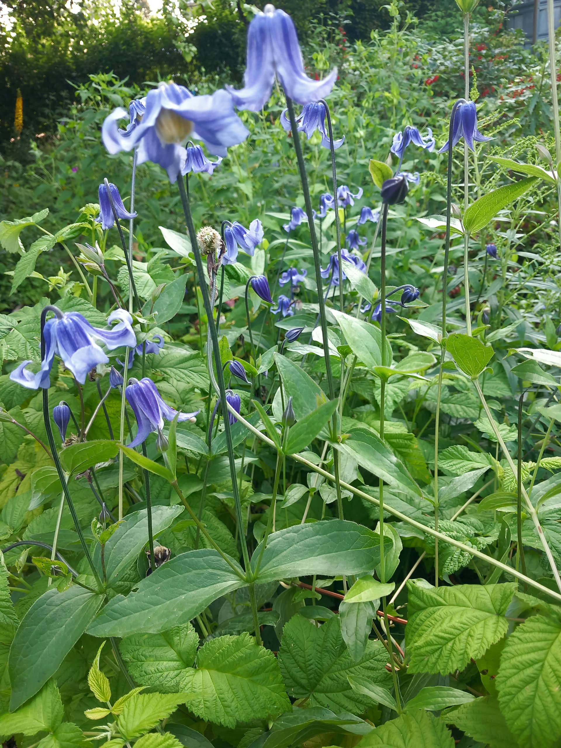 Minä olen tehnyt aitaverkosta lieriön ja alaosasta leikannut poikkiverkon pois ja näin sain piikit jotka voi työntää maahan. Tuossa kellokärhöni on tillipionin ja toisen pionin välissä.