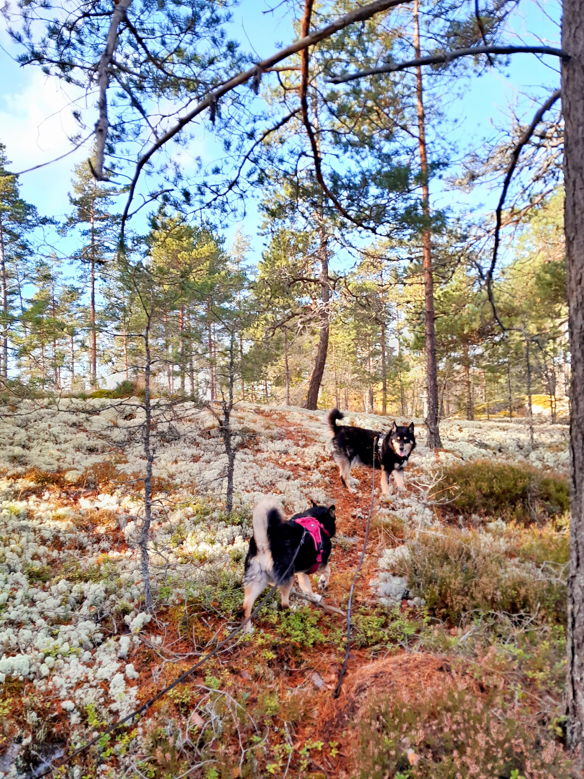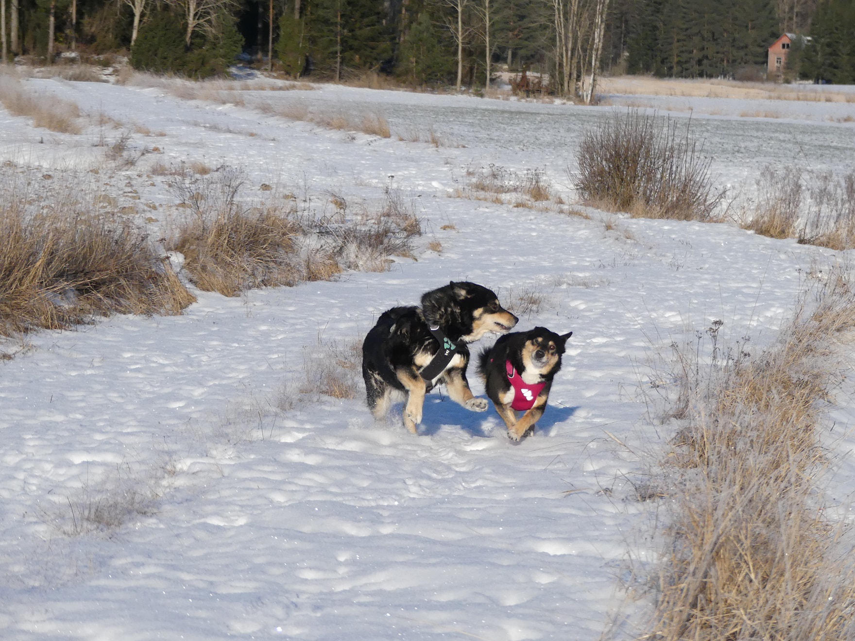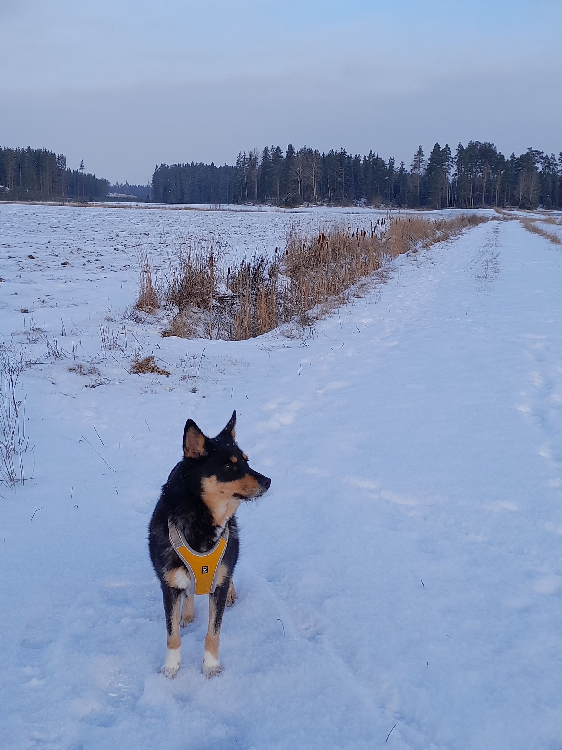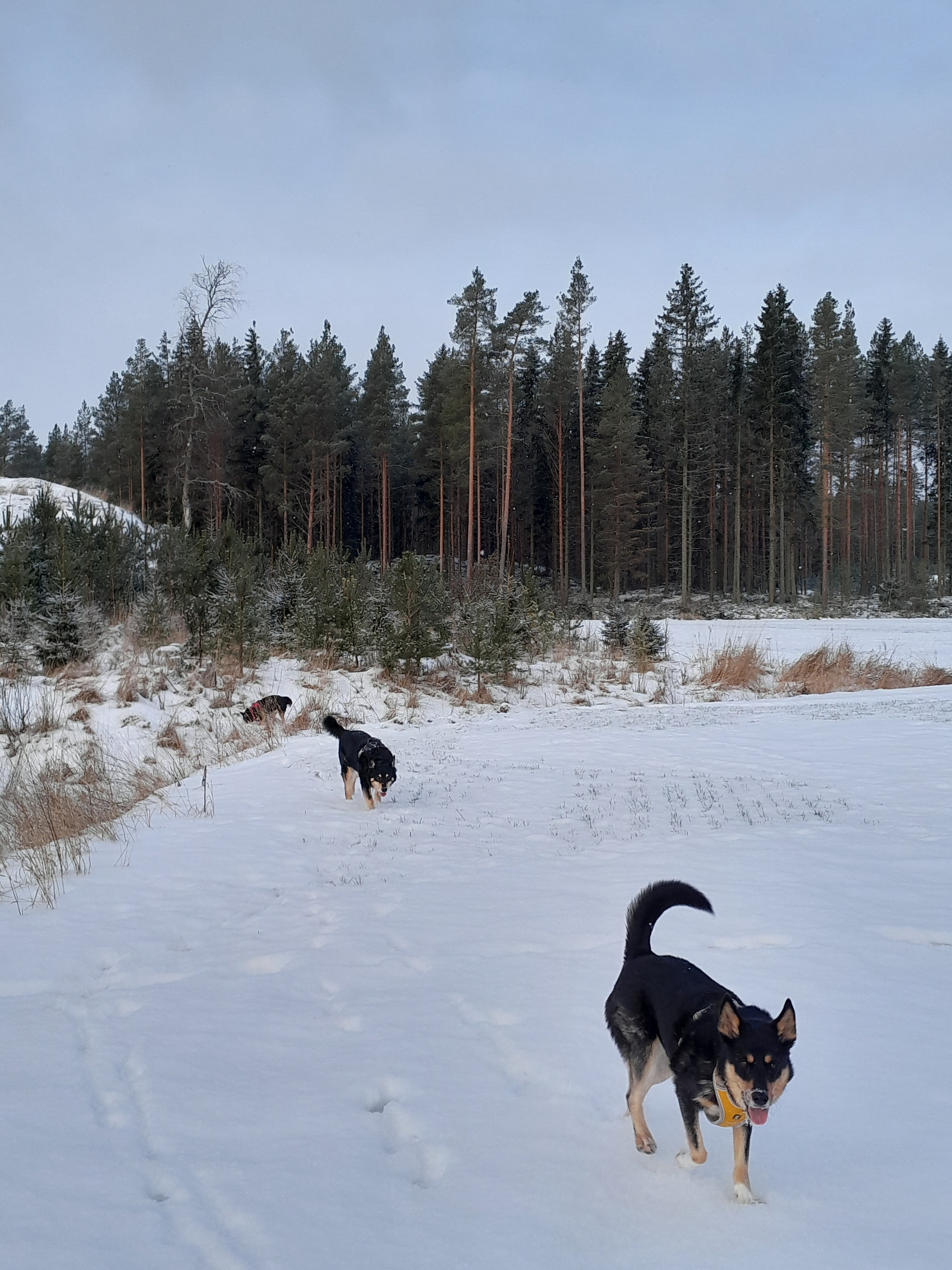 Me lenkkeillään talvisin paljon pelloilla ja peltoteillä ja niityillä. Ei oo niin liukas ku tiellä ja ei tarvii mennä autojen seassa. ![]()