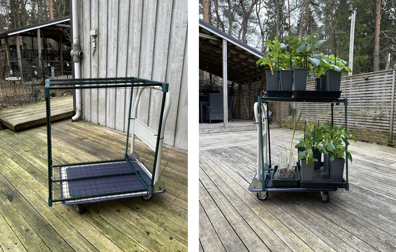 Daalioiden ja Cannojen jokapäiväinen ulkokaraiseminen käy voimille niin tein sitten ulkoilutason pyörillä eli kärry + kevarikasvarin putkista kaksi tasoa. Kas kummaa kun työt sujuu paremmin kun on pyörät alla ![]()