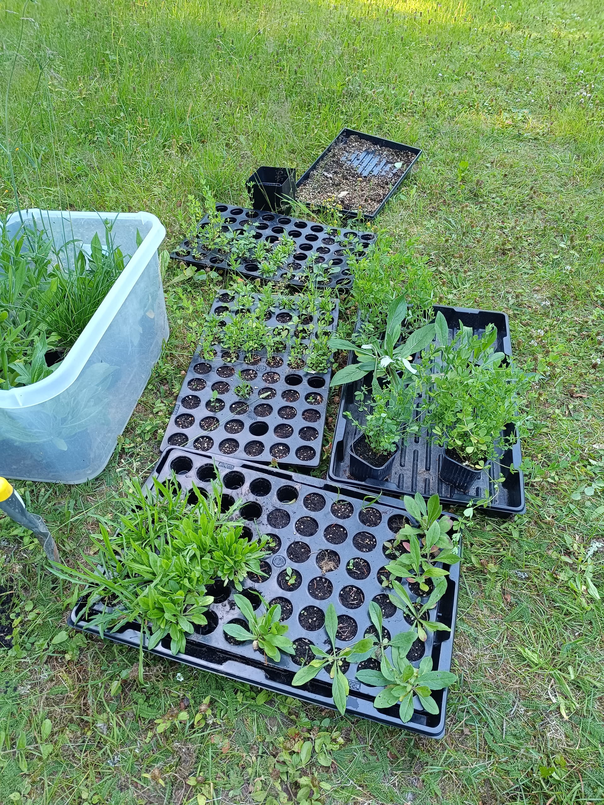 Kylvin peurankelloa, ranta-alpia, pulskaneilikkaa, pietaryrttiä ja niittyleinikkiä, kaikki omista siemenistä Peurankellot ja ranta-alpi on tienvarsilöytöjä, kukkivat tosi komeasti jostain syystä viime vuonna, kun aikaisempina vuosia oli vain ihan muutama Pitihän se sitten ottaa sitä paikallista kantaa talteen!