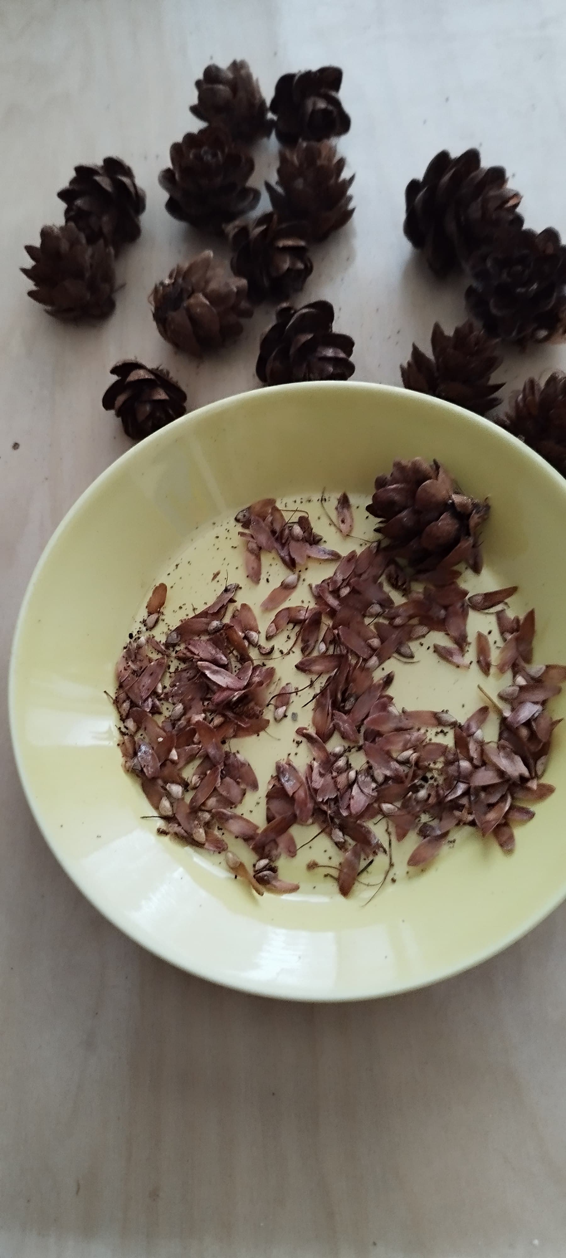 Keräilin kunnan maalta lehtikuusen alaoksista käpyjä ja laitoin astiaan kuivahtamaan. Noista tuli paljon sirmeniä. Vaativat kylmäkäsittelyn itääkseet tai kylvetään ulos jo syksyllä. Siemenet alkavat karista maaliskuussa.