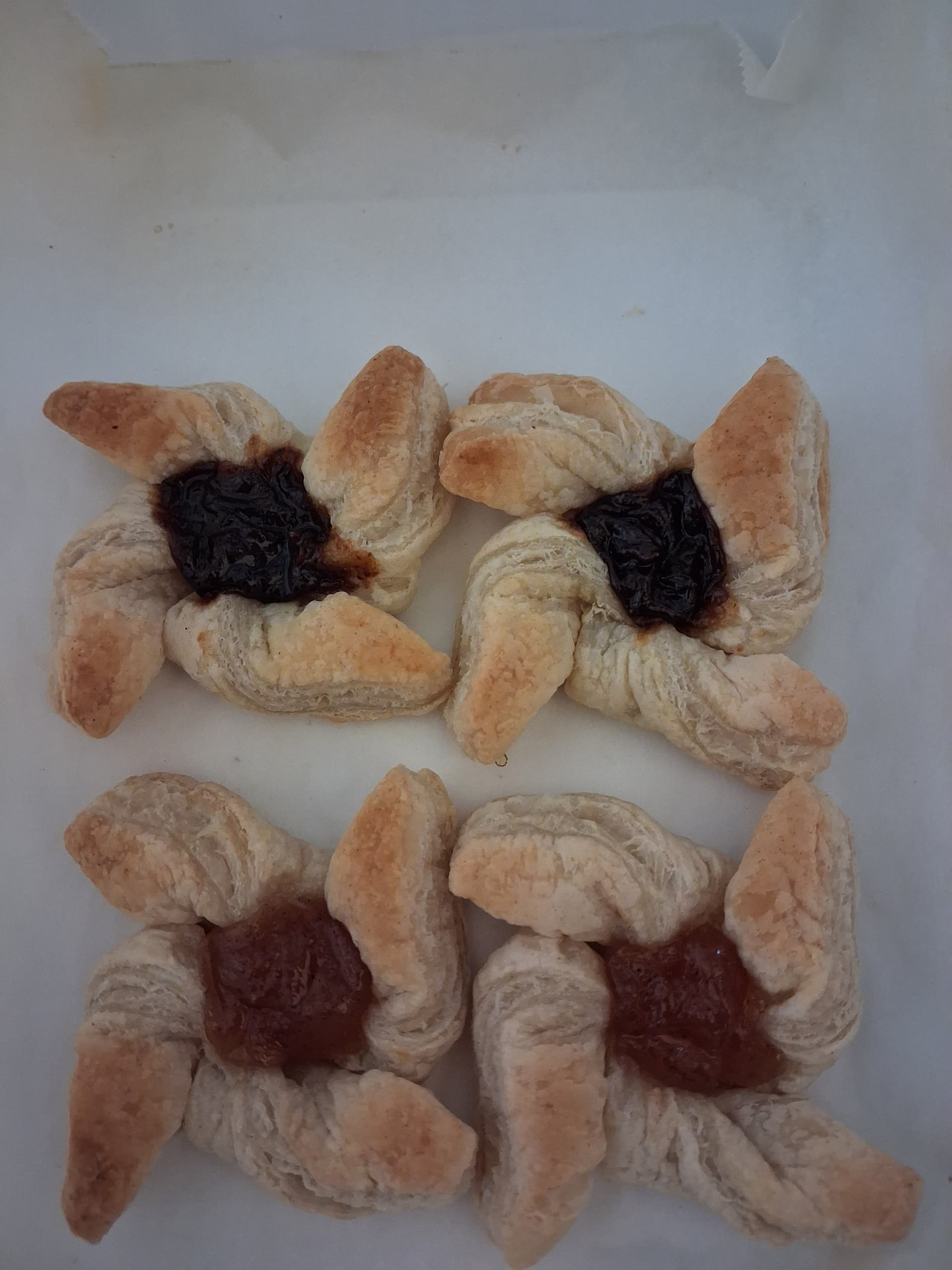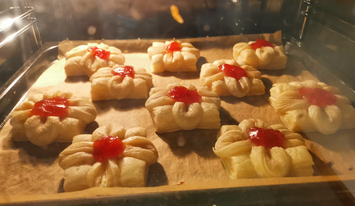 Nuo nurkat voi leikata vähän pyörtäviksi kun taittaa sen taikinaneliön kolmioksi.