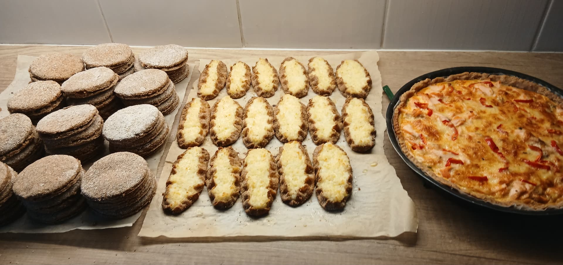 Lohikanttarellipiiras, riisipiirakoiden ja ruisleipästen kera.