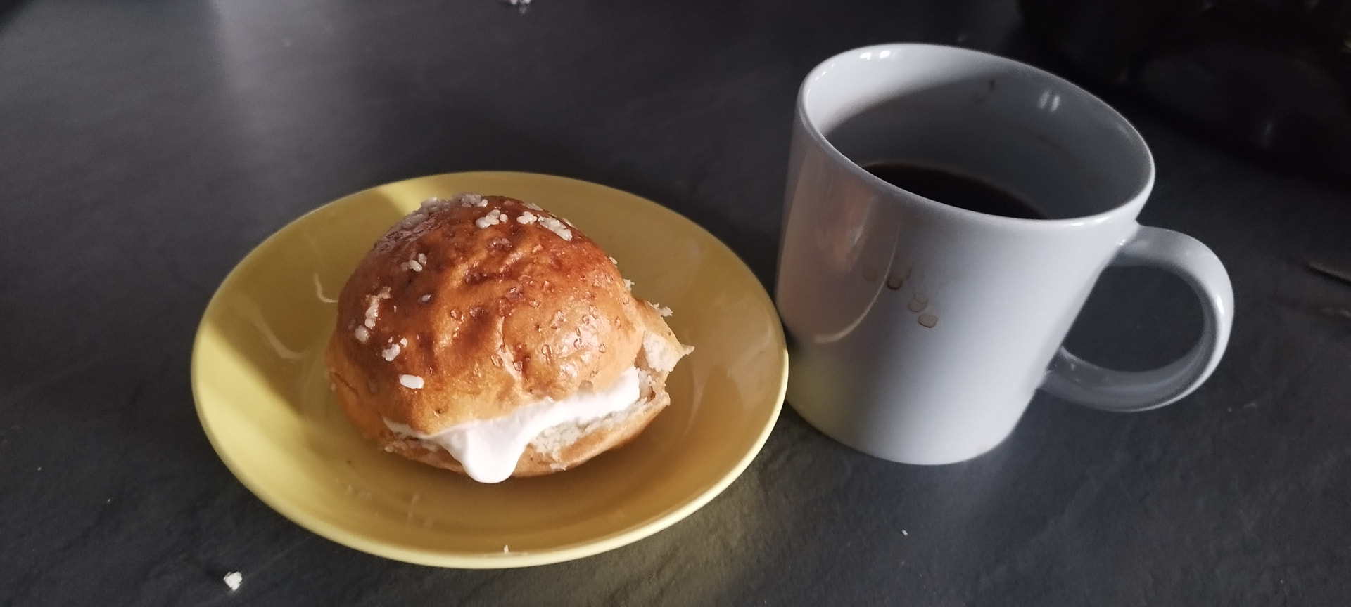 Laiskiaispulla, eilen ostin pussillisen termarikahville järvelle. Luulin, että repussa jäätyi, ei ollut jäässä vaan kuivaa. Tänään kuumensin mikrossa vesilasin kanssa ja laitoin vaniljajäätelöä väliin.