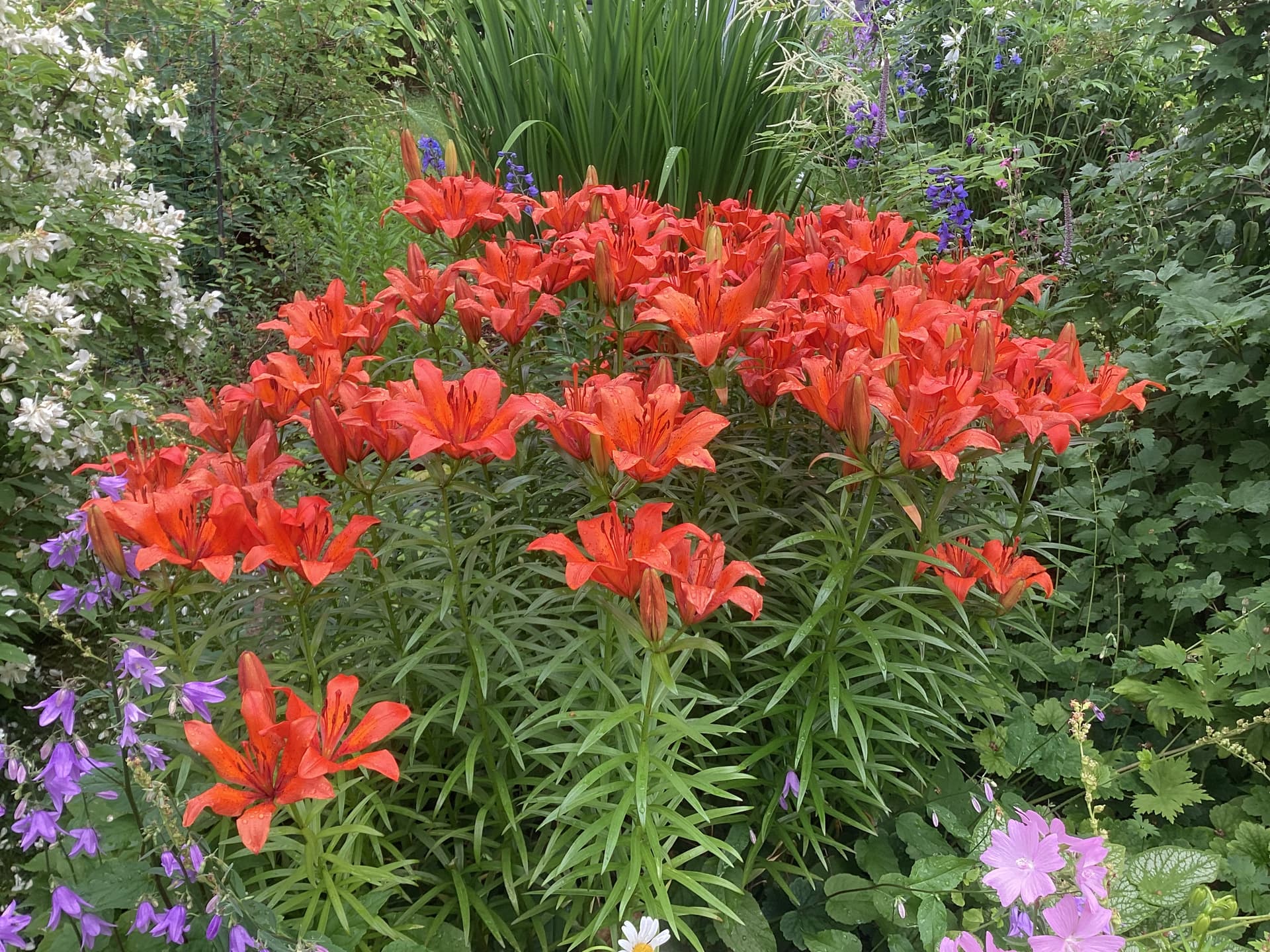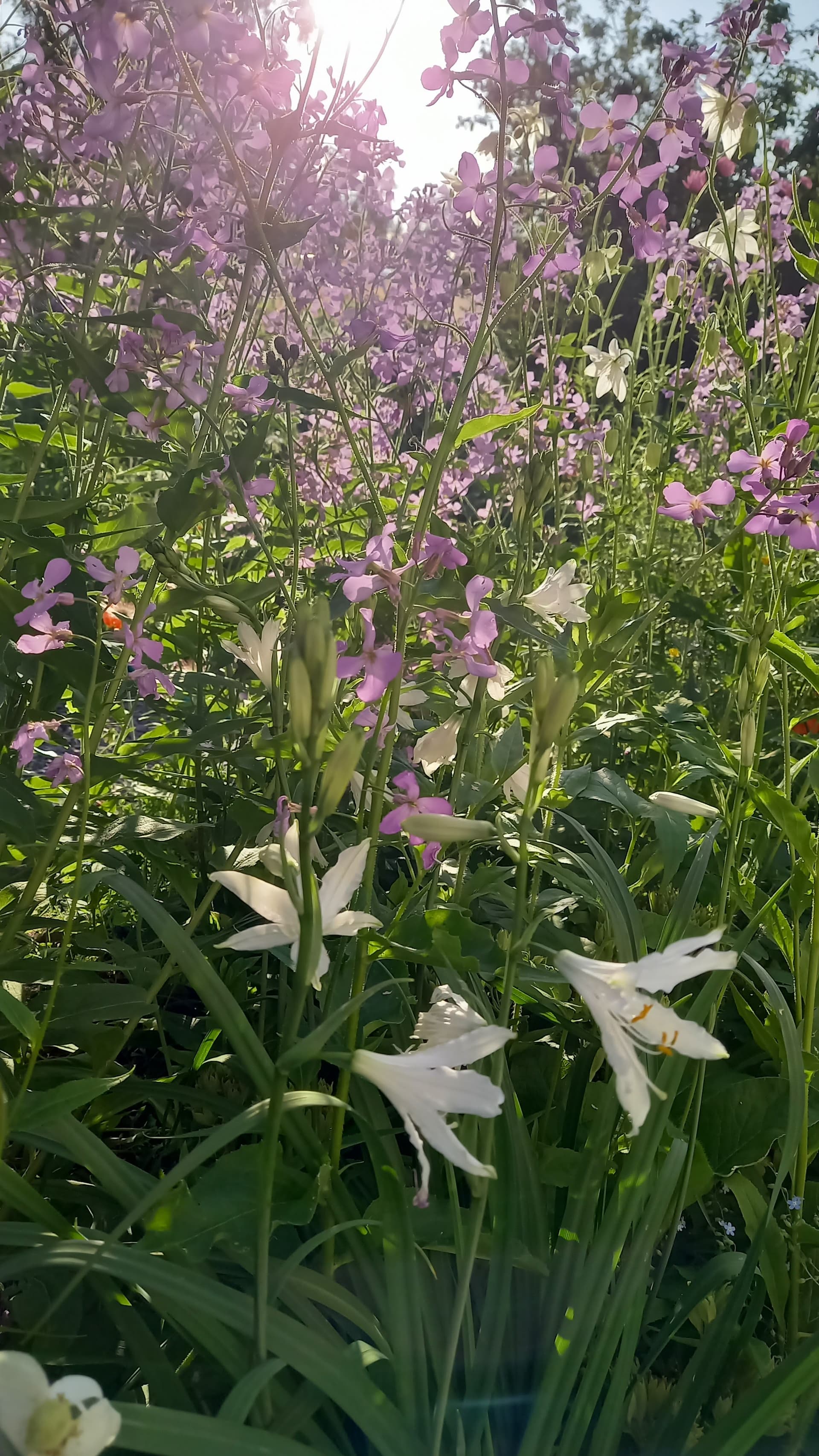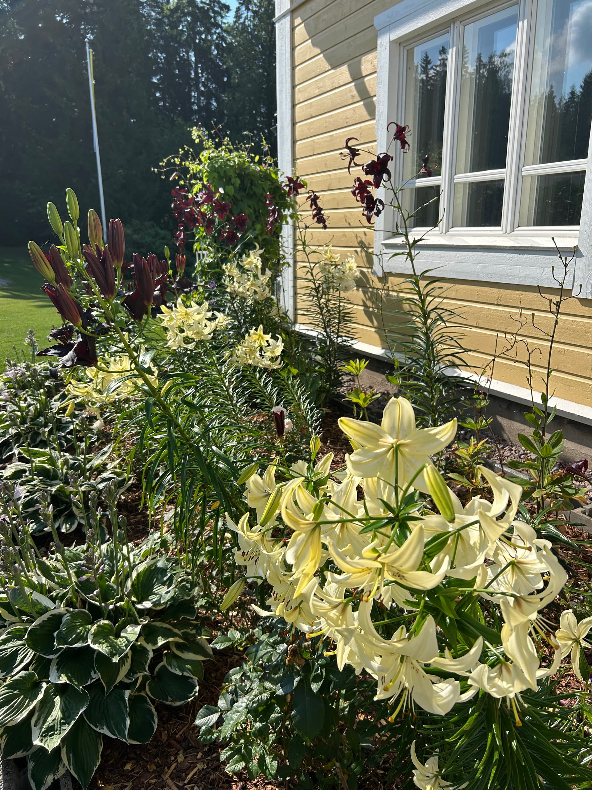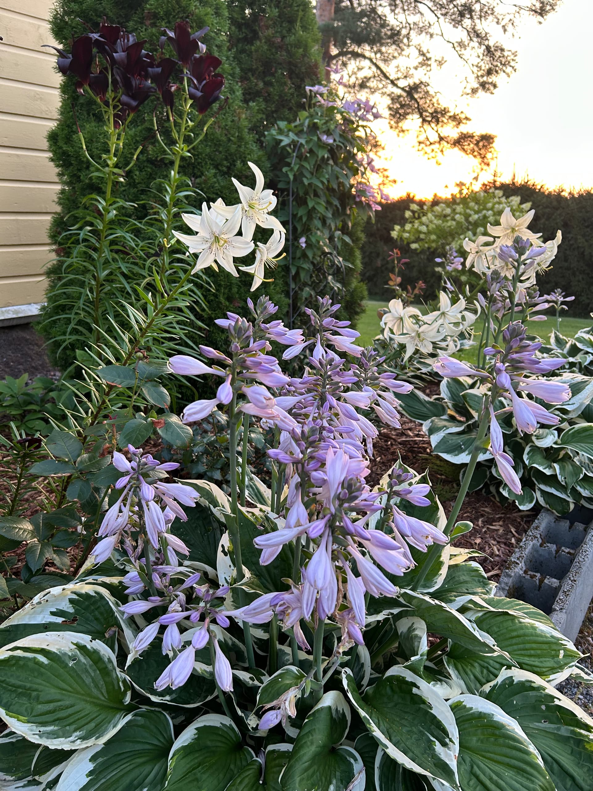 Valkoiset ovat jo kukinnan lopussa. Etualalla kuunliljat ja seassa kasvaa myös ruusuja.