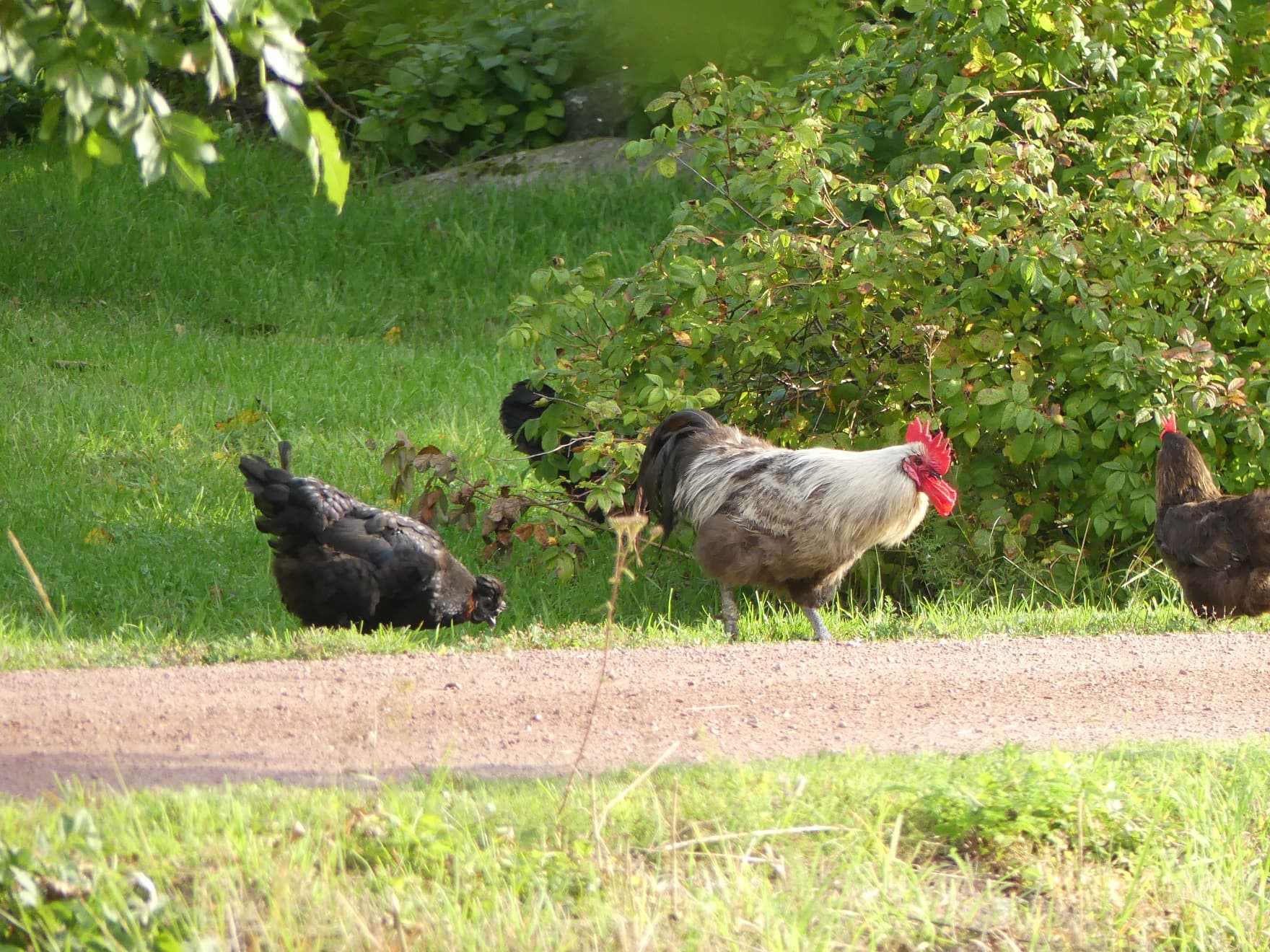 Kukko ja kanat, nämä vipelsi siellä yhden talon pihassa vapaana.