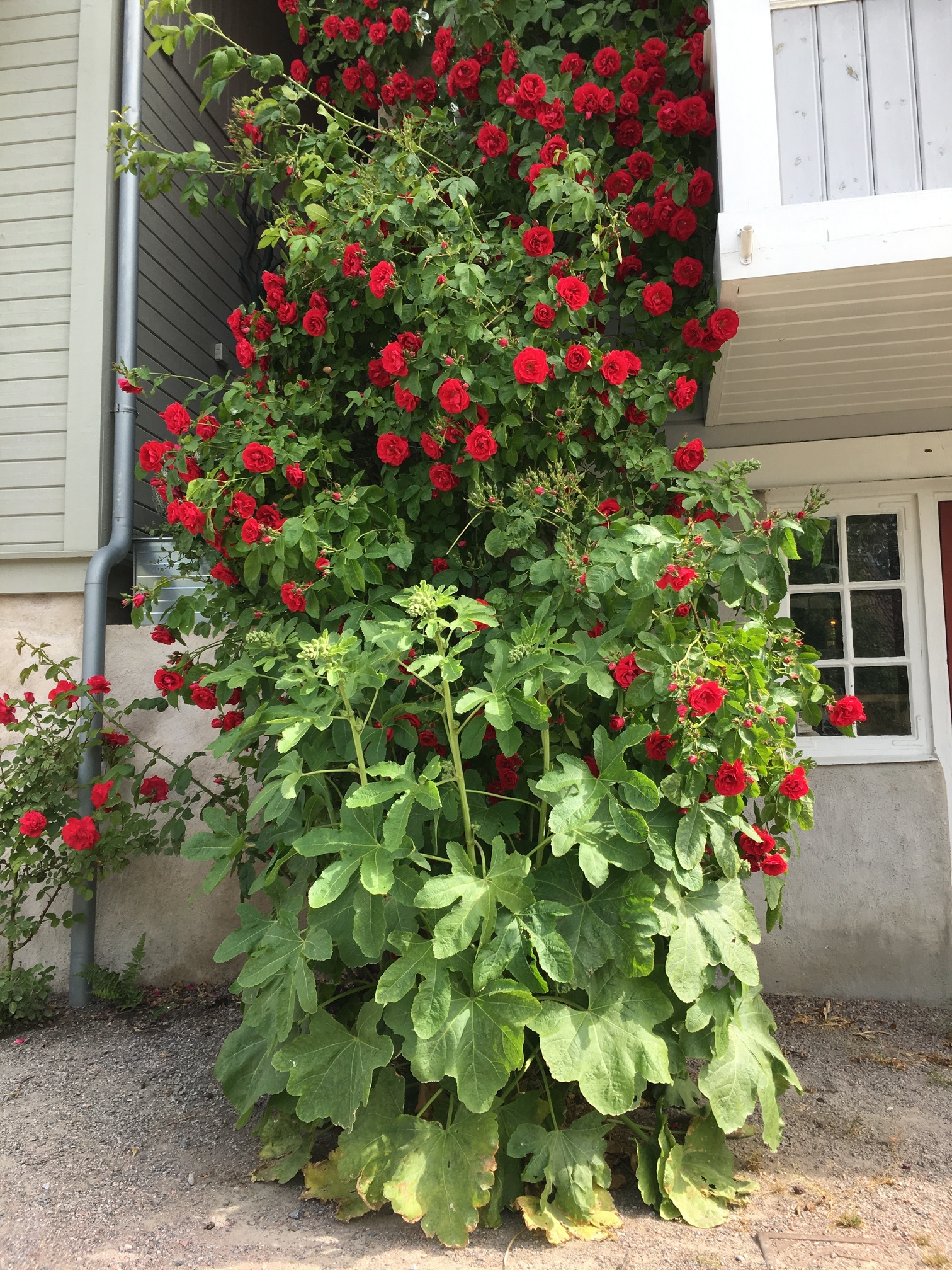Tämä kuva on Ruotsista. Siellä kasvaa joka talon seinustalla köynnösruusut ja liuskasalkoruusut.