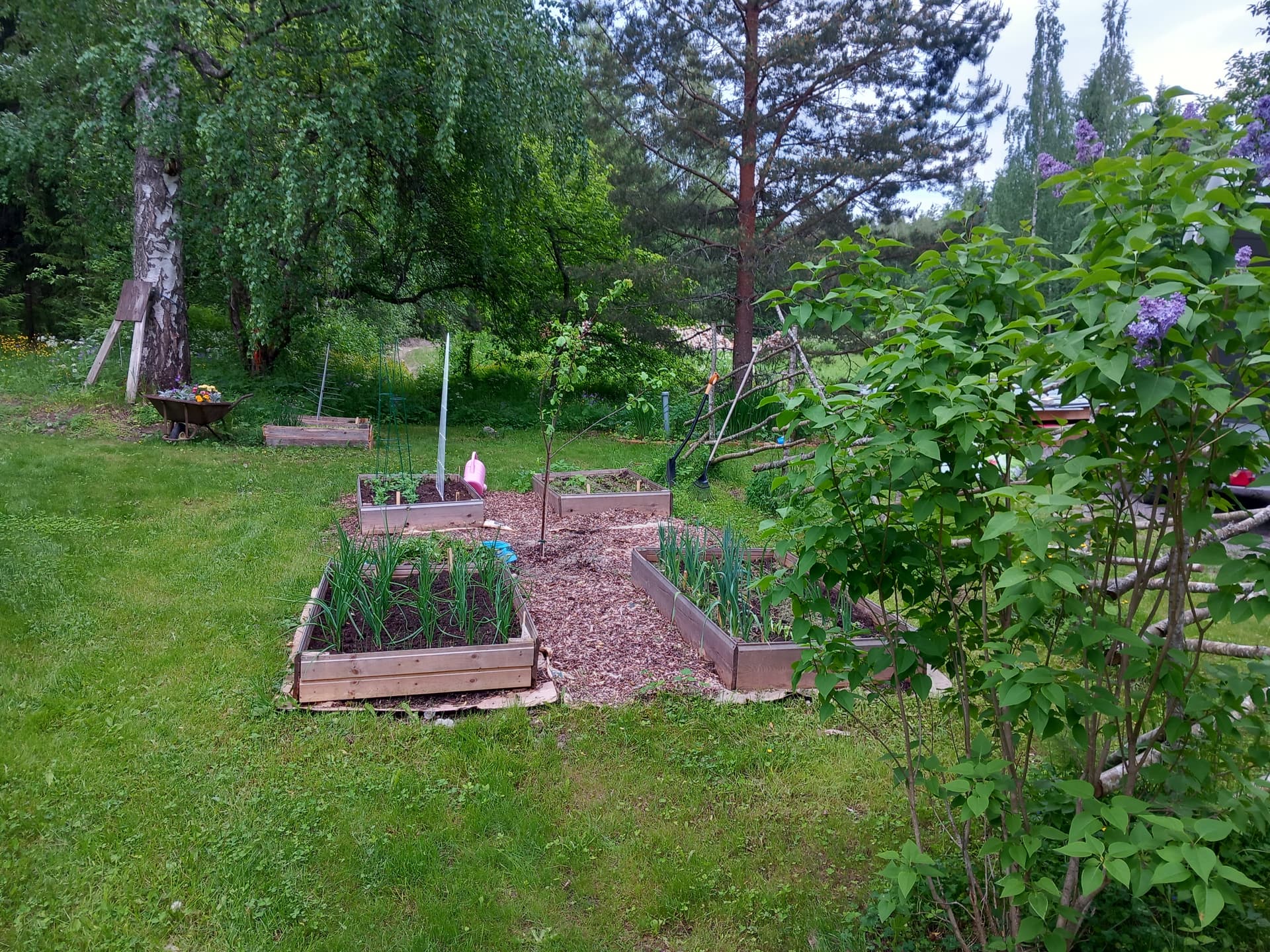 Kasvimaan paikalla oli ennen sauna, se siirrettiin toisaalle. Jäljelle jäi tasainen alue (niitä pihassa on tasan kaksi, sillä tontti on etelään viettävä rinne).