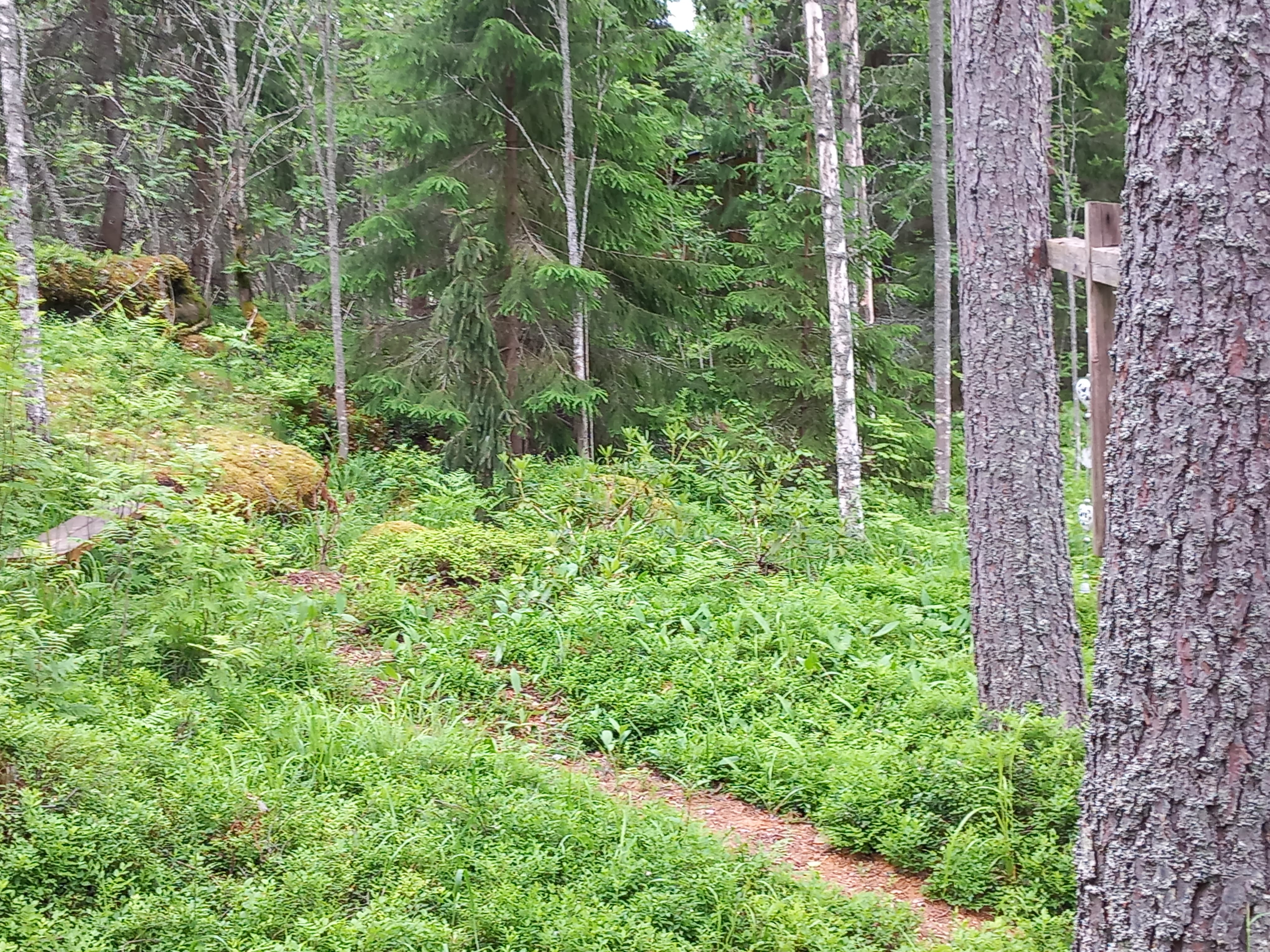 Pinnanmuodoista sen verran, että talo on tukevasti kallion päällä. Rinne laskee edessä kulkevalle tielle etelän suuntaan. Siinä rinteessä on puutarha. Kalliota puskee esille siellä täällä. Ja kiviä riittää kaikkialla muualla paitsi savisessa pellossa. Heti talon takaa alkaa metsä puolu- ja mustikoineen.