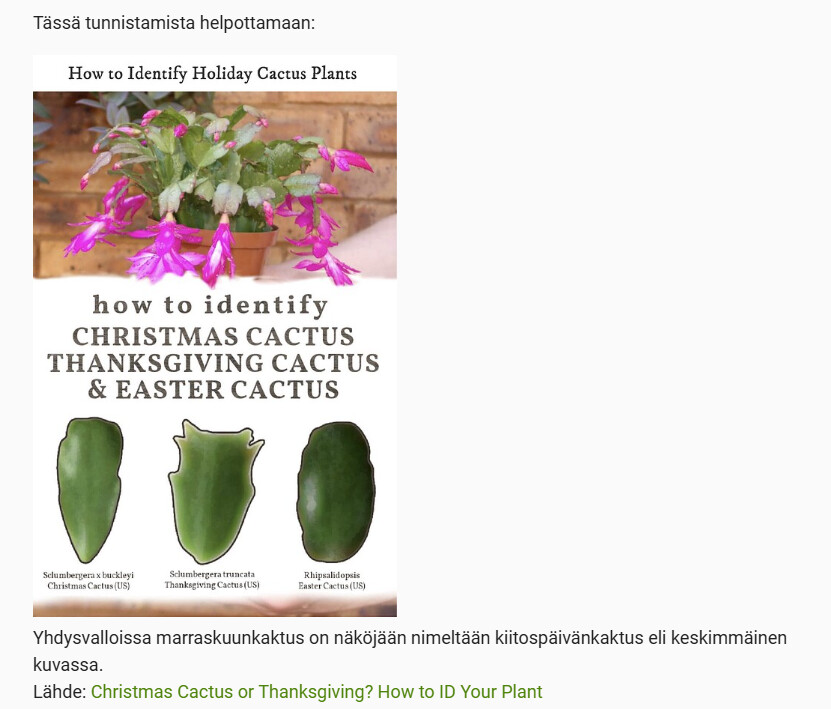 LeonM jakoi 11.11.2025 allaolevan infon marraskuunkaktuksen, joulukaktuksen ja pääsiäiskaktuksen tunnistamista helpottamaan. Otin siitä kuvakaappauksen tähän ketjun aloitusviestiin. 1 lehti joulukaktus, 2 lehti marraskuunkaktus ja 3 lehti pääsiäiskaktus.