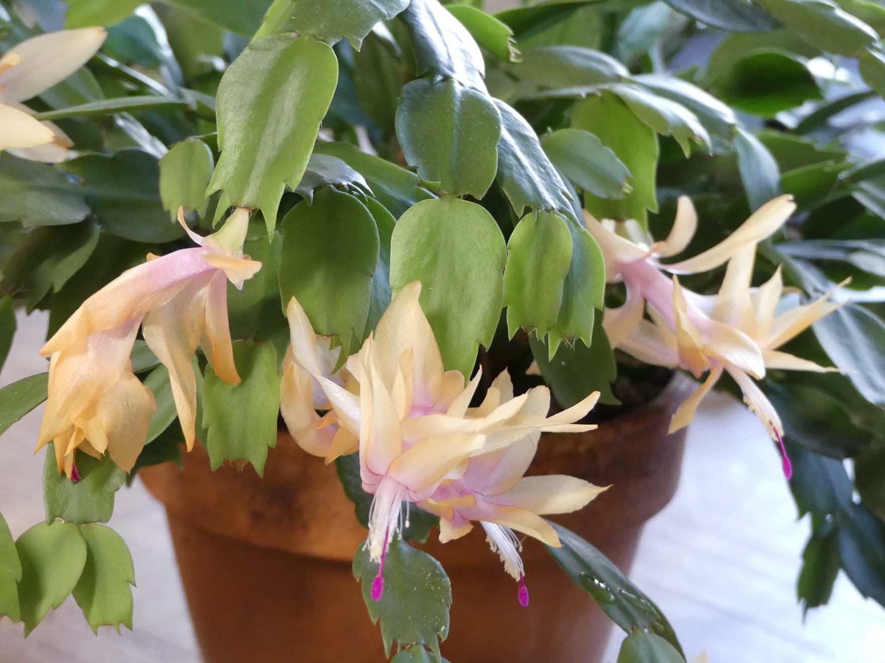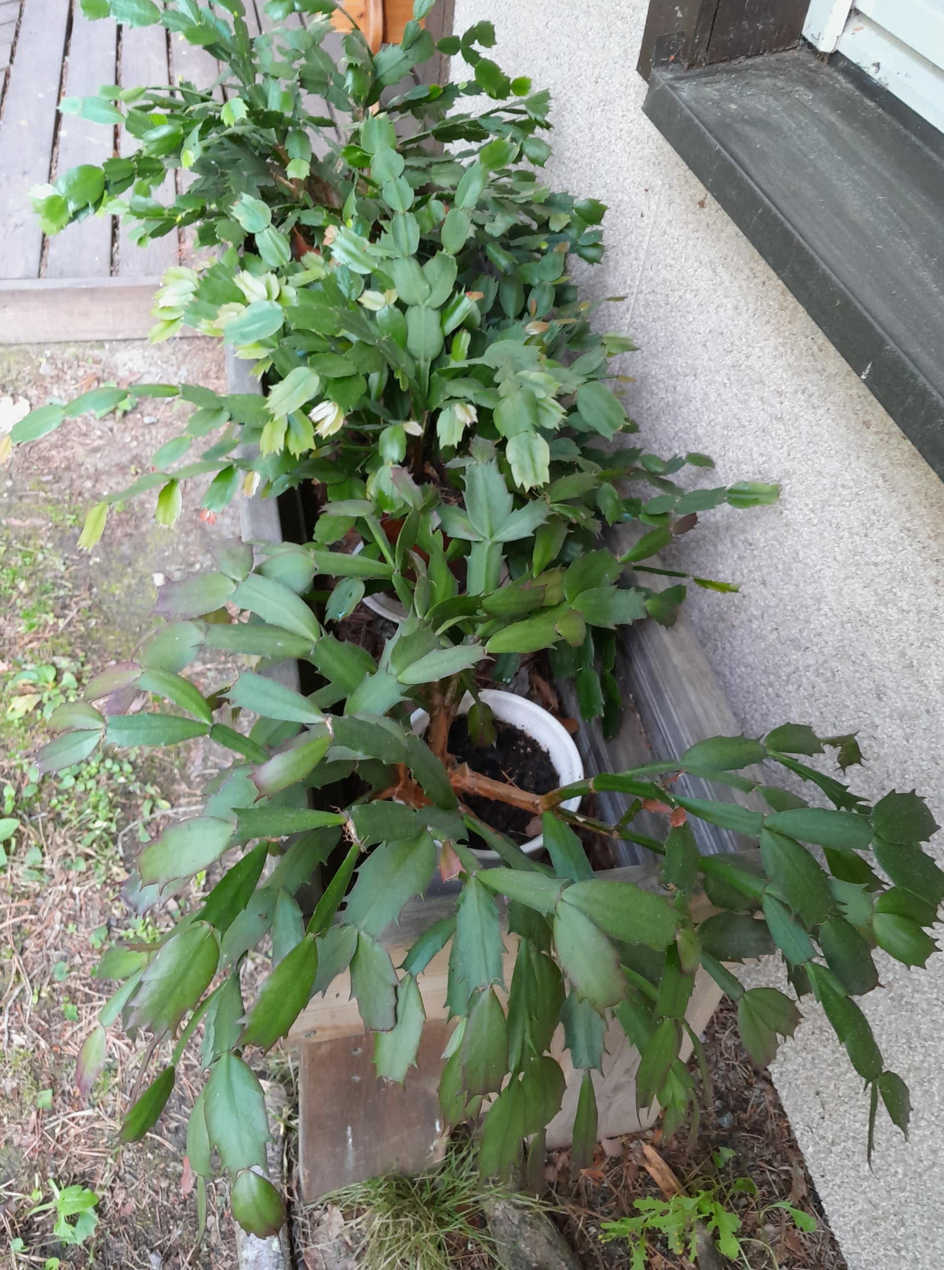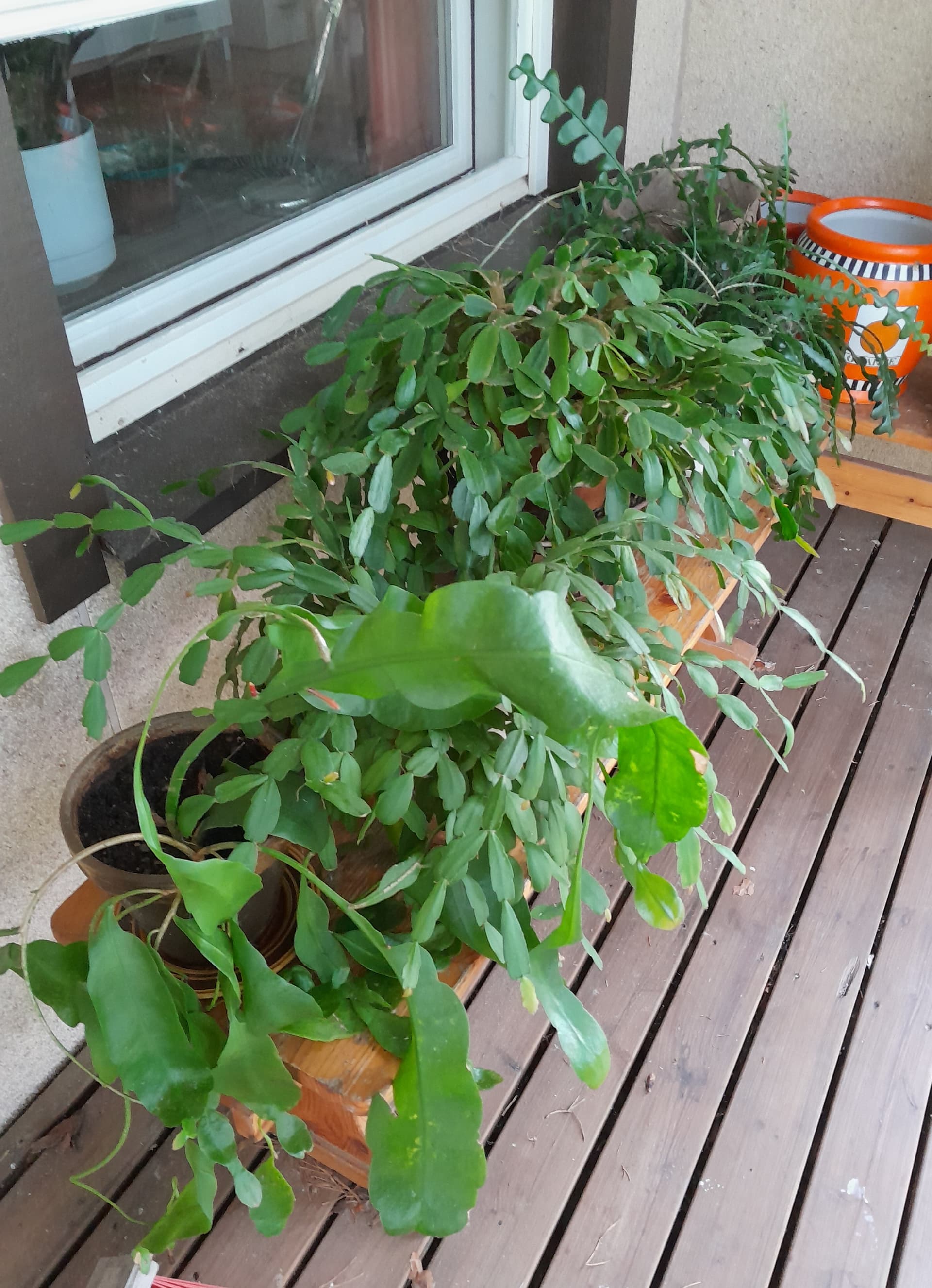 Minulla on joulu- ja marraskuunkaktukset pohjoisen puoleisella verannaalla. Lehdet ovat upeita ja kiiltäviä. Ihan samassa paikassa ja samalla hoitamattomuudella on myös kevätkaktus, sen lehdet on hyvin aneemisen näköiset. Olen monta pohtinut mistä moinen johtuu, tämä on tuttu ilmiö vuosien varrelta.