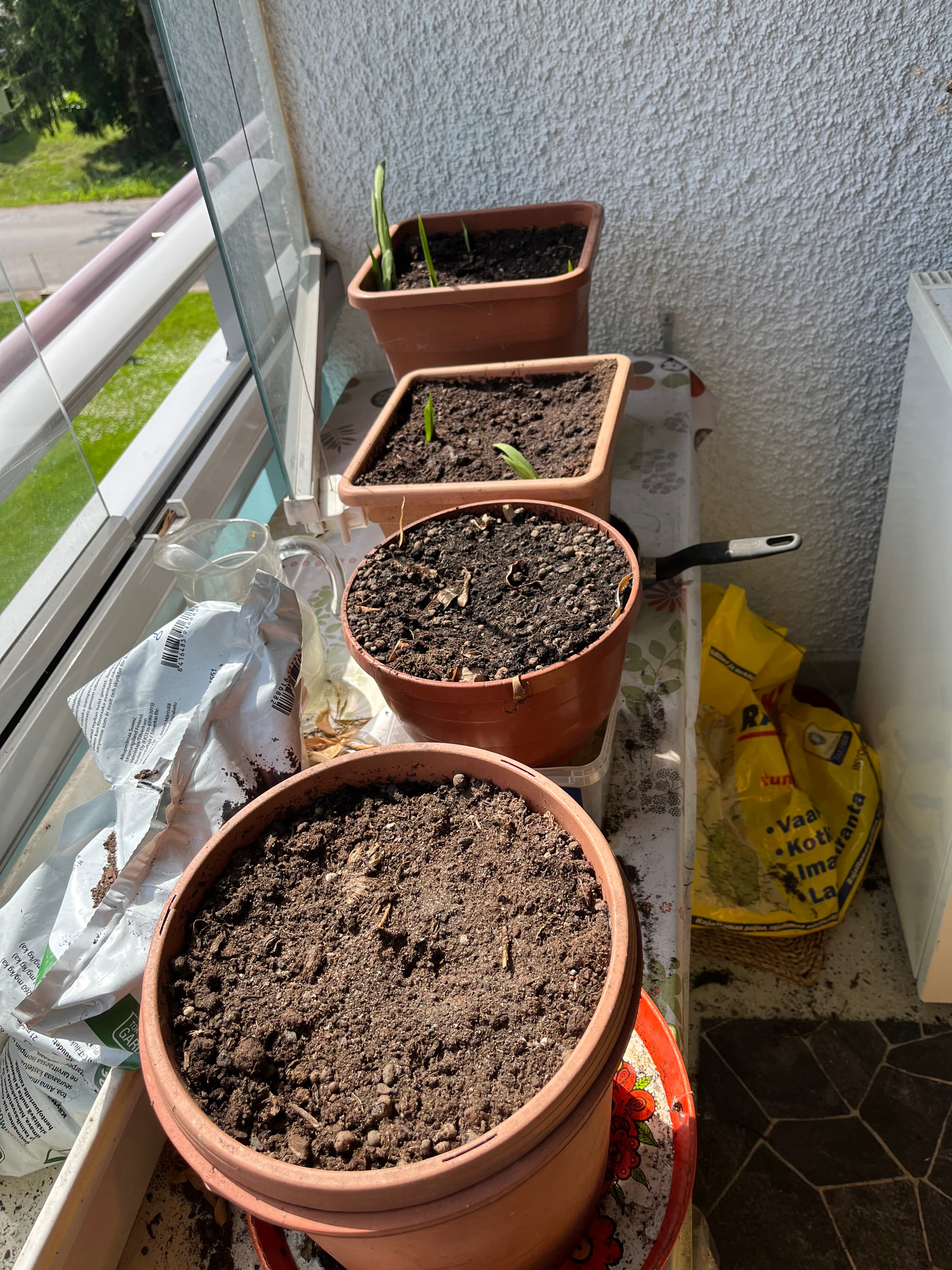Laitoin ne 12.7 aikoihin 5-6 ruukkuun vieri/vieriin, ja äipän lasitetulleparvekkeelle..