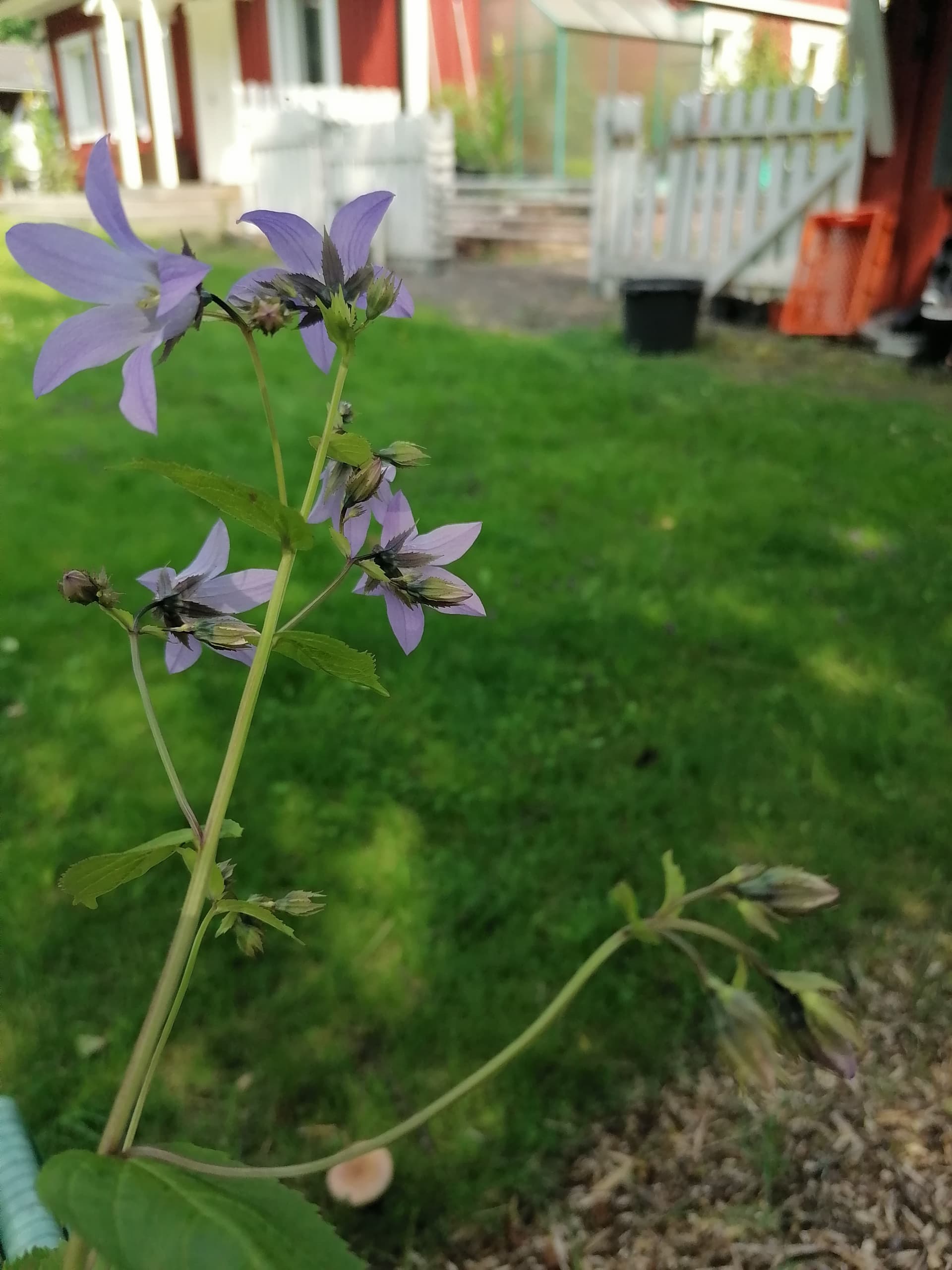 Kuvasin Lensille katkaisemaani vartta kokonaisuudessaan, se kummiskin näyttää itse zoomaavan pelkästään siihen kukintolatvaan. Sanoi että todennäköisesti on ukonkello. Otin toisesta kulmasta Lensillä uudelleen ja harakankelloksi väitti. Ja jos en tietäis varmaksi ettei tää se ole niin voisin uskoakin koska kukkahan on ihan niinku harakankellolla.