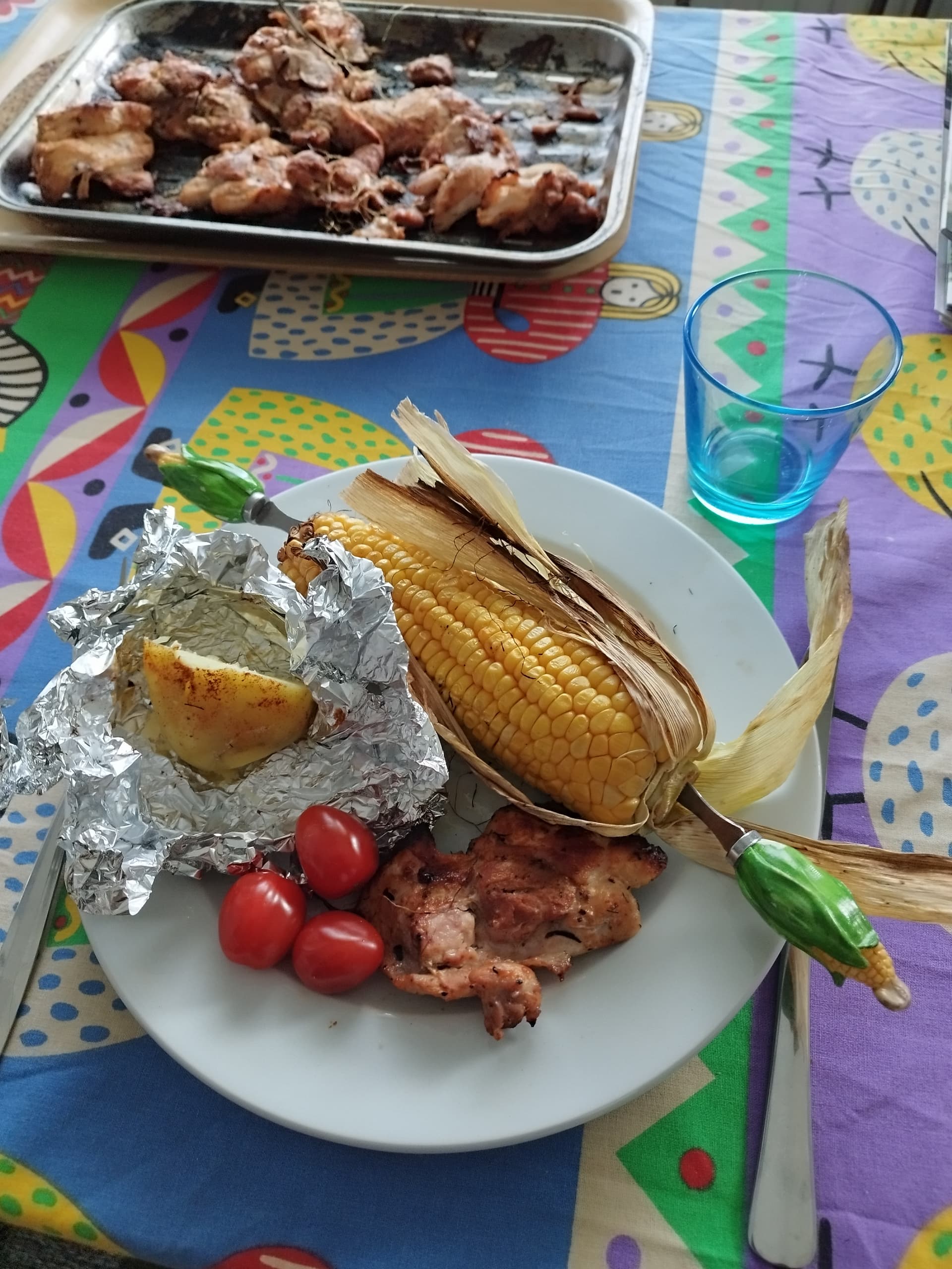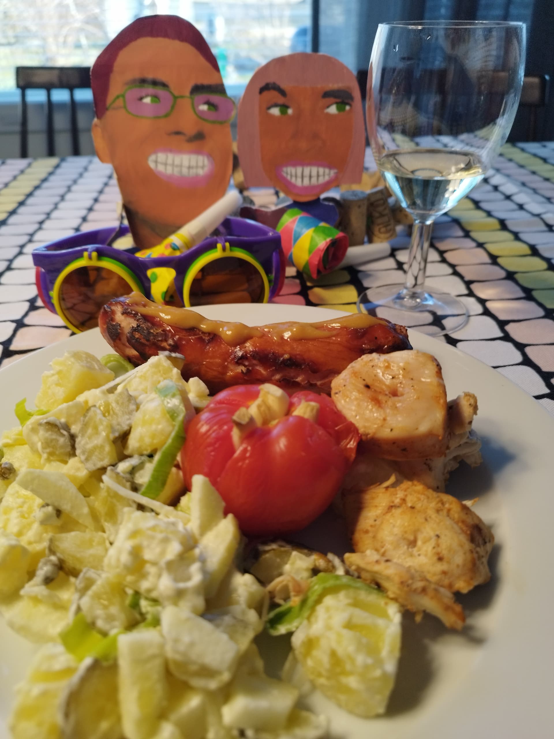 Kohta 25 v on samat wappuvieraat saaneet paikkansa ruokapöydässä. Hiiligrilli ja kotitekoinen pottusalaatti. Lapsen kuvistunnin tuotos 2000 luvun alusta.