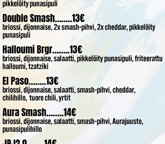Meidän porukasta olin ainut joka sai oman hampparinsa (Double smash) loppuun syötyä, ranskalaisista jouduin minäkin jo tinkimään. Kun ei mahdu niin ei mahdu. Lapsenlapsi otti Aura Smashin, sai syötyä yli puolet ennenkuin joutui luovuttamaan. Yritti kyllä kovasti kun oli niin hyvää.