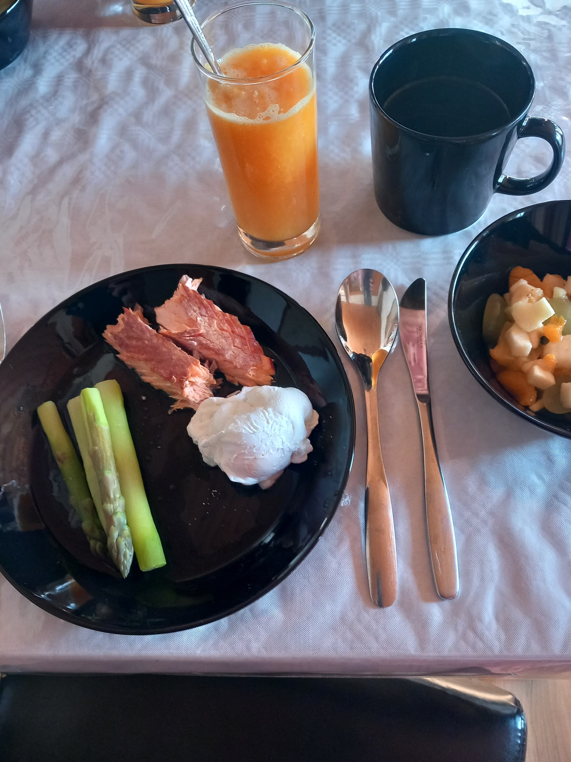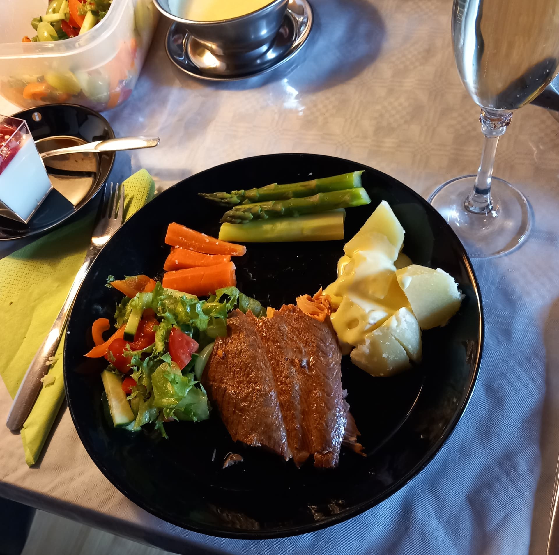 Päivällä lammasta ja valkosipuliperunat. Juomaksi punkkua. Jälkkäriksi pashaa ananaksen kanssa.
