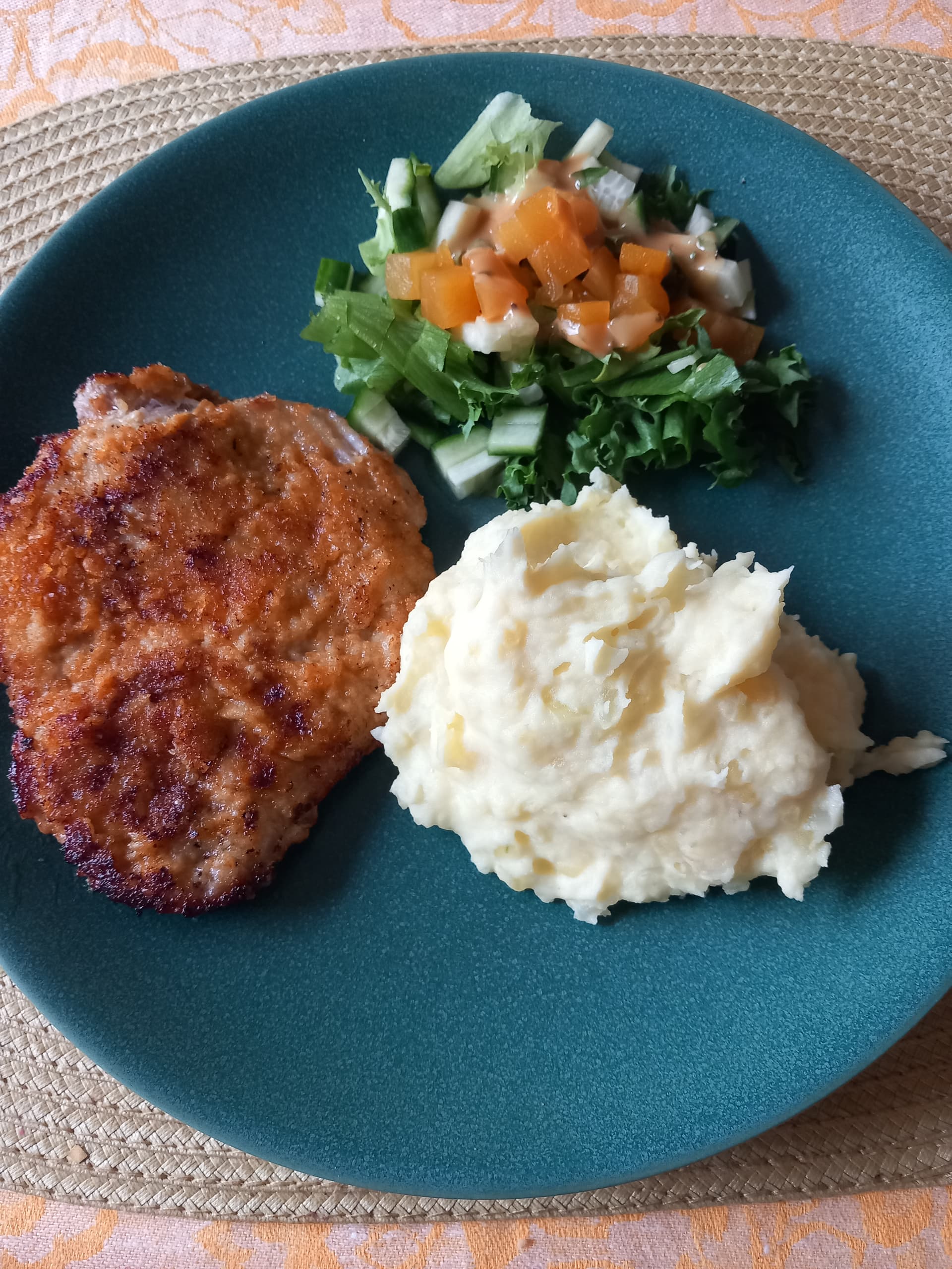 En hokannu ottaa kuvaa,päivän pihvi,porsaanleike metsäsienikastikkeella(ei onneksi ollu paneroitu)mulle kaaviksilla ja mussukalle muusilla.All3 salaattipöytä.