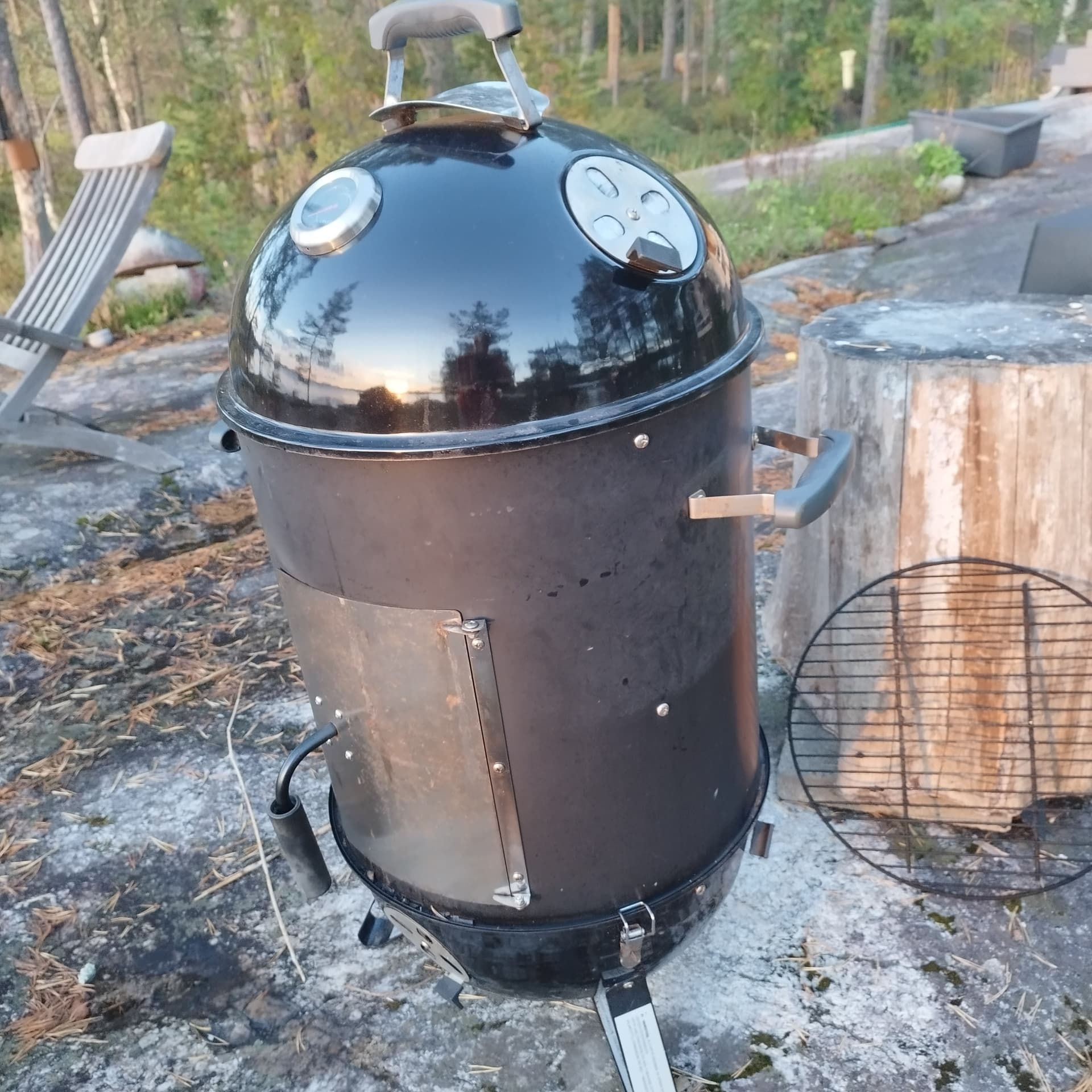 Omat perunat, sipulit, tuoreet yrtit ja tomaatit, luumut, omenaa, karjalanpaisti lihaa ja broilerin koipipaloja, lihat päälimmäiseksi. Maustekori viereen ja pusseista lusikoiden mausteita reilusti. Kiva kun ruoan voi tehdä ulkona pöydän ääressä istuen. Kotona on tavallinen savipata, hiiligrillissä on lämpömittari ja valmistuu talvellakin ihan varmasti. Karjalanpaisti ja makaronilaatikko eivät vaan maistu.