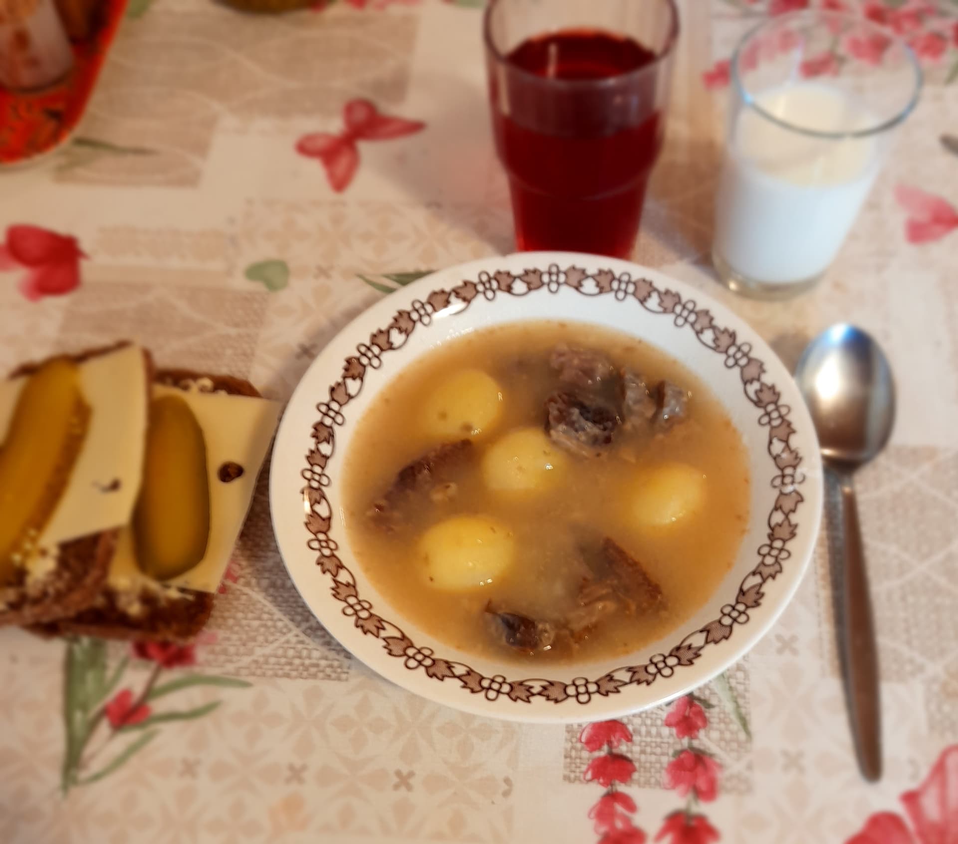 Perunat, jauhelihapihvit ja sienisoosi.